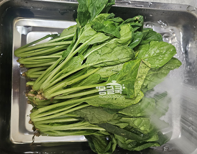 시금치는 깨끗이 씻어 뿌리를 다듬고, 긴 것은 2~3등분 해주세요.