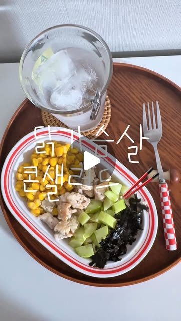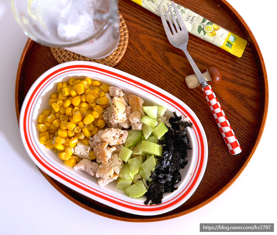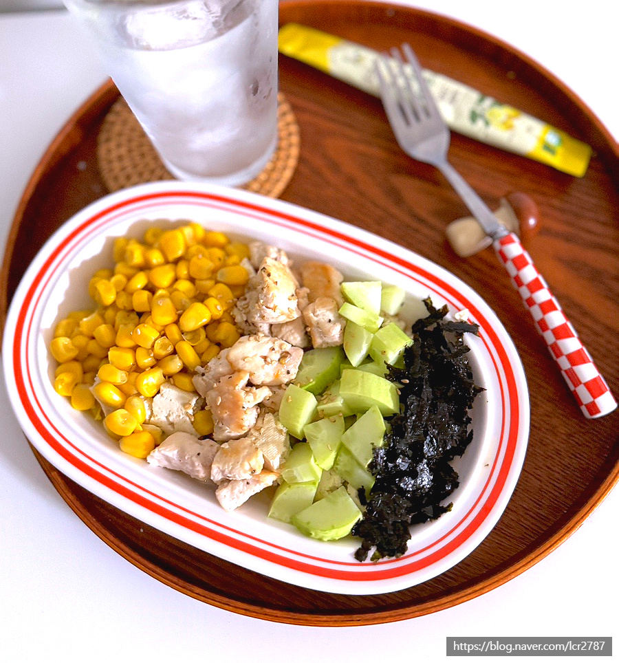 그 위에 옥수수 콘 오이 닭 가슴살을