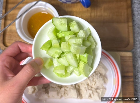 물기를 꼭 빼줘야 소스와 섞였을 때 묽어지지 않아요.