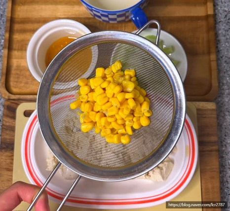 재료의 물기 제거해 주세요.먼저 옥수수 콘을 체에 밭쳐 물기를 제거해 주세요.