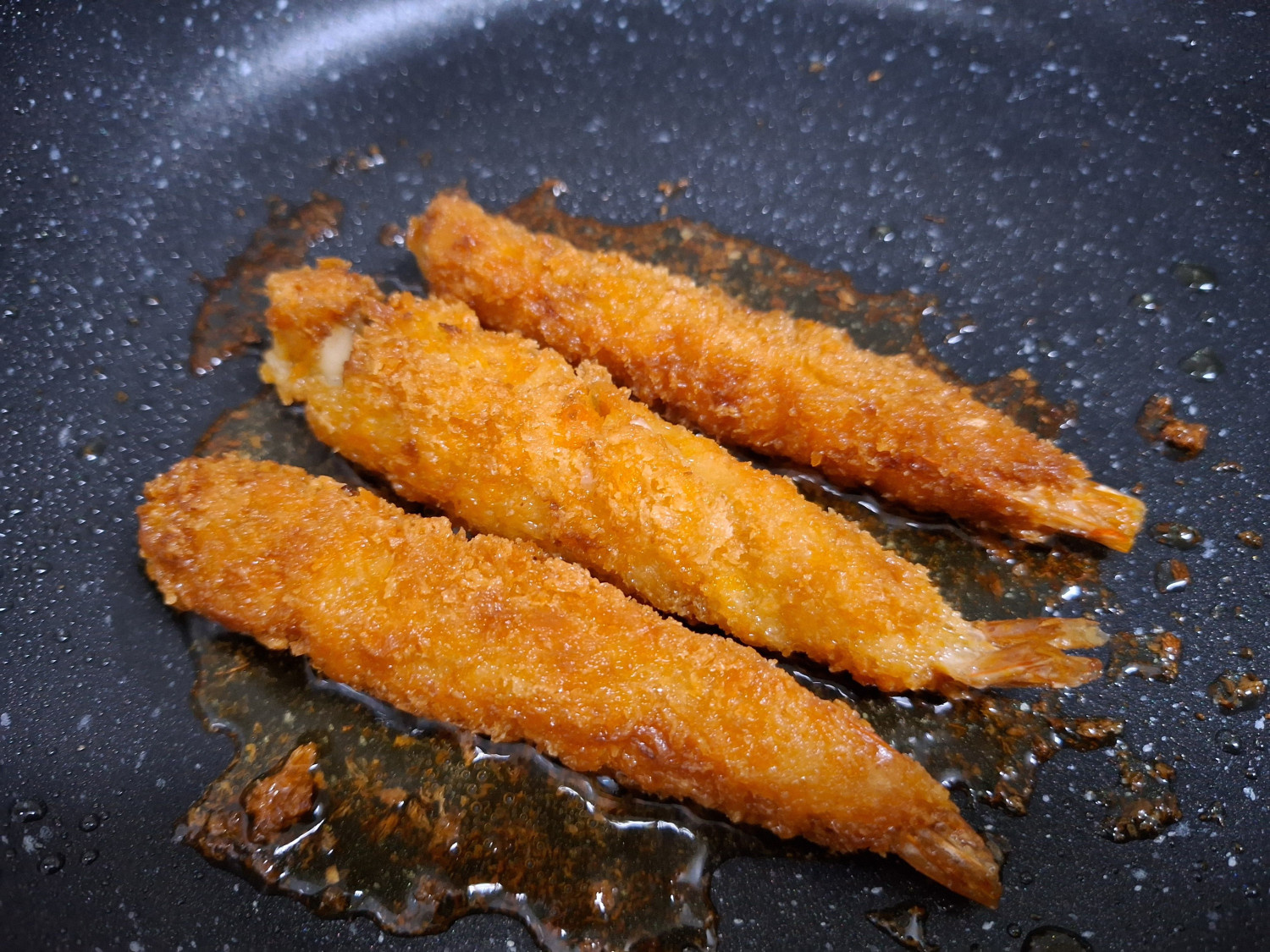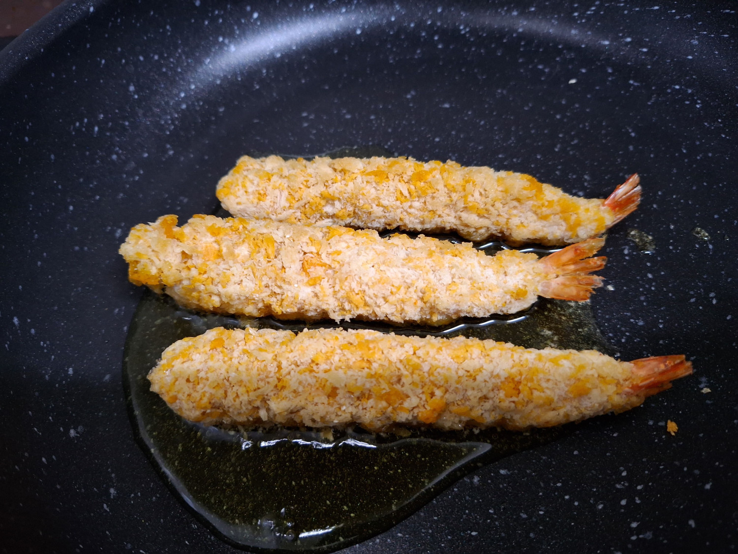 팬 위에 새우튀김을 올리고 30초정도만 끓여주셔도 좋아요.
