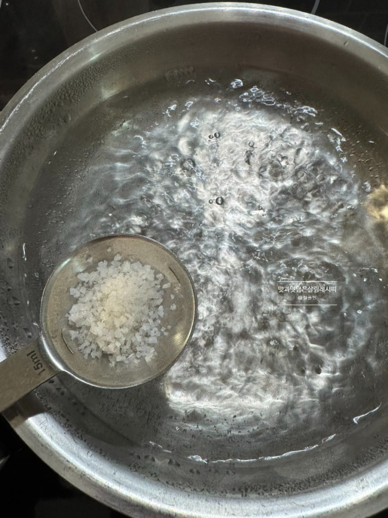 가볍게 데쳐주는 작업인데요. 물이 끓으면 소금 반 큰술과 함께 손질한 꽈리를 넣고 1분 이내로 살짝 데칩니다.