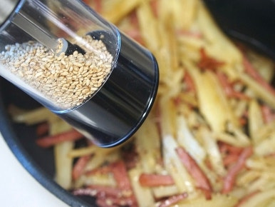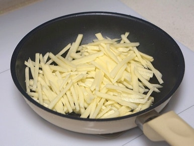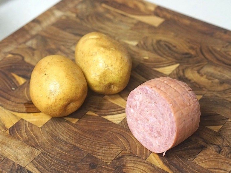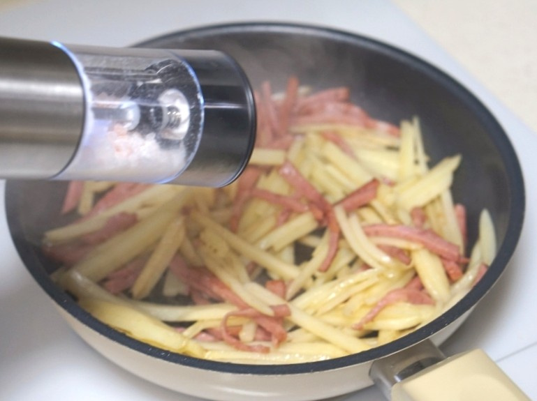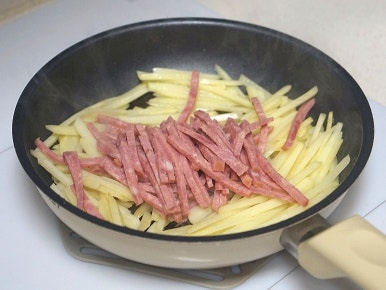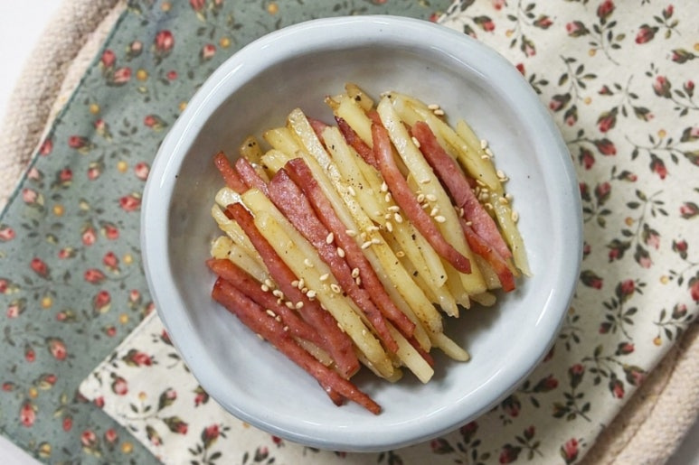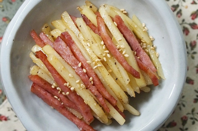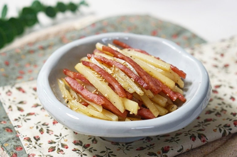 감자는 탄수화물이 풍부하지만 기름에 튀기지 않고 볶아내면 가볍게 즐길 수 있고 전분기를 제거한 감자채는 서로 들러붙지 않아 더욱 깔끔한 맛으로 즐길 수 있어요. 감자채의 굵기는 일정해야 골고루 익고, 전분기를 빼주어야 팬에 눌어붙지 않아요. 특히 아이들 반찬으로 준비할 때에는 햄을 넣어주면 단백질 보충과 동시에 맛이 풍부해져서 햄감자볶음 하나만으로 밥 한공기를 뚝딱할 수 있어요. 소금으로만 간을 맞춰 담백하면서도 깔끔한 맛의 스팸 감자채볶음 레시피 소개해 드릴게요 '◡'