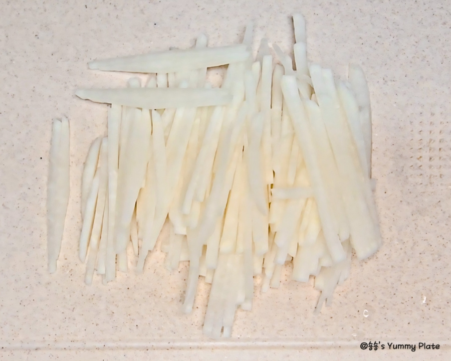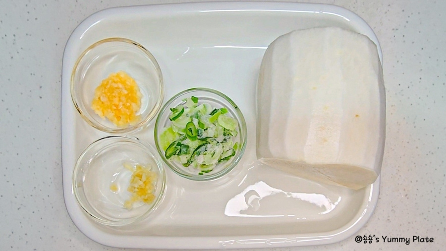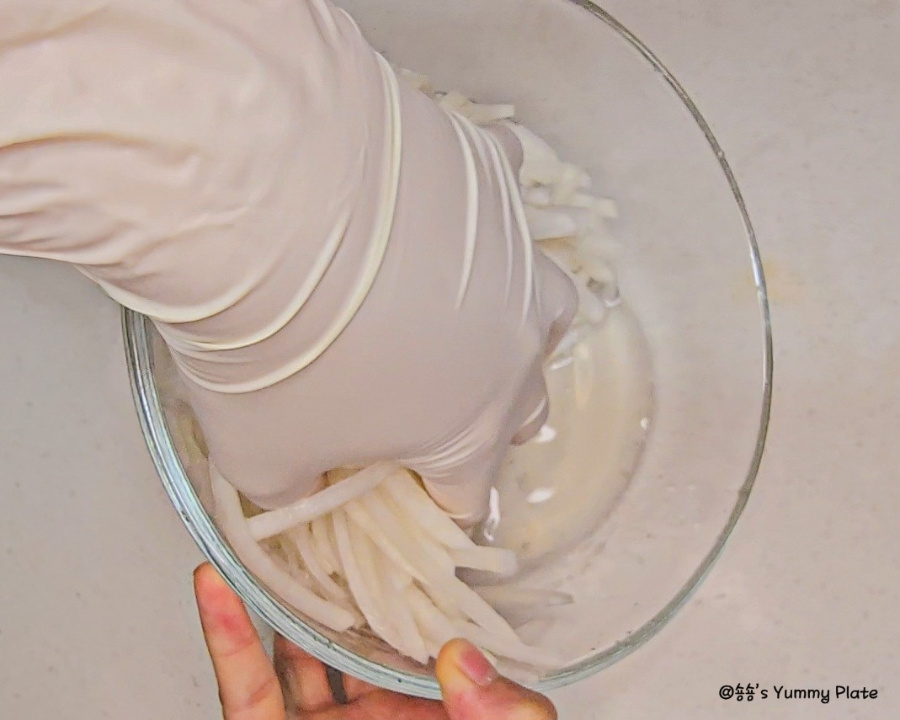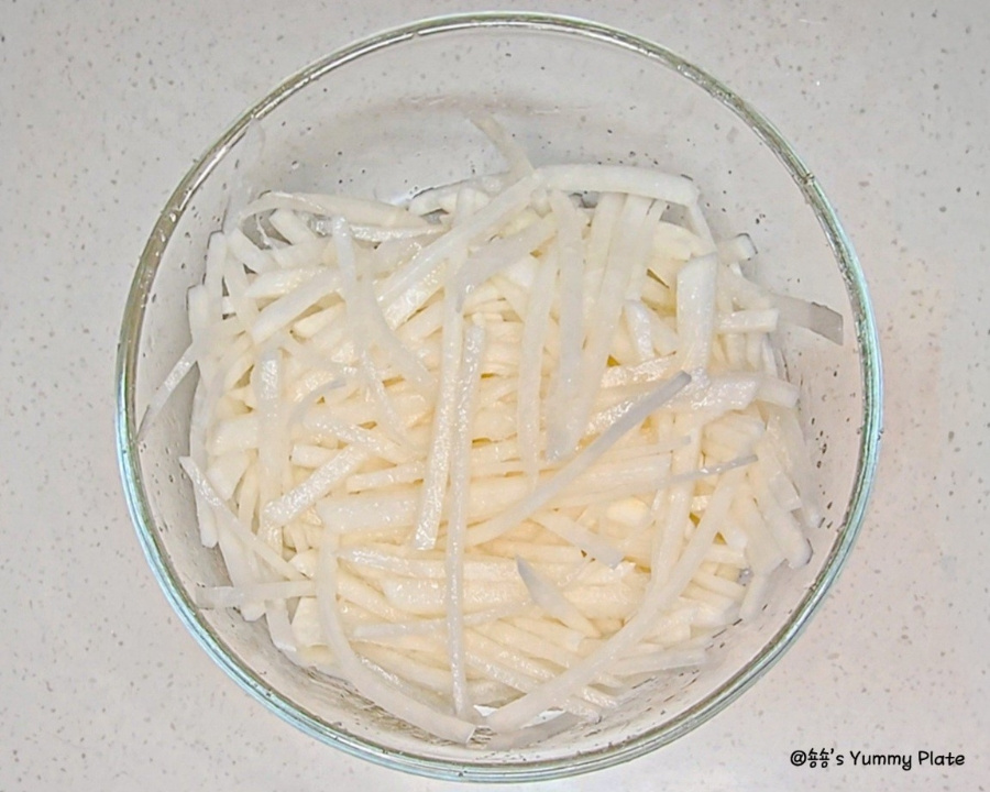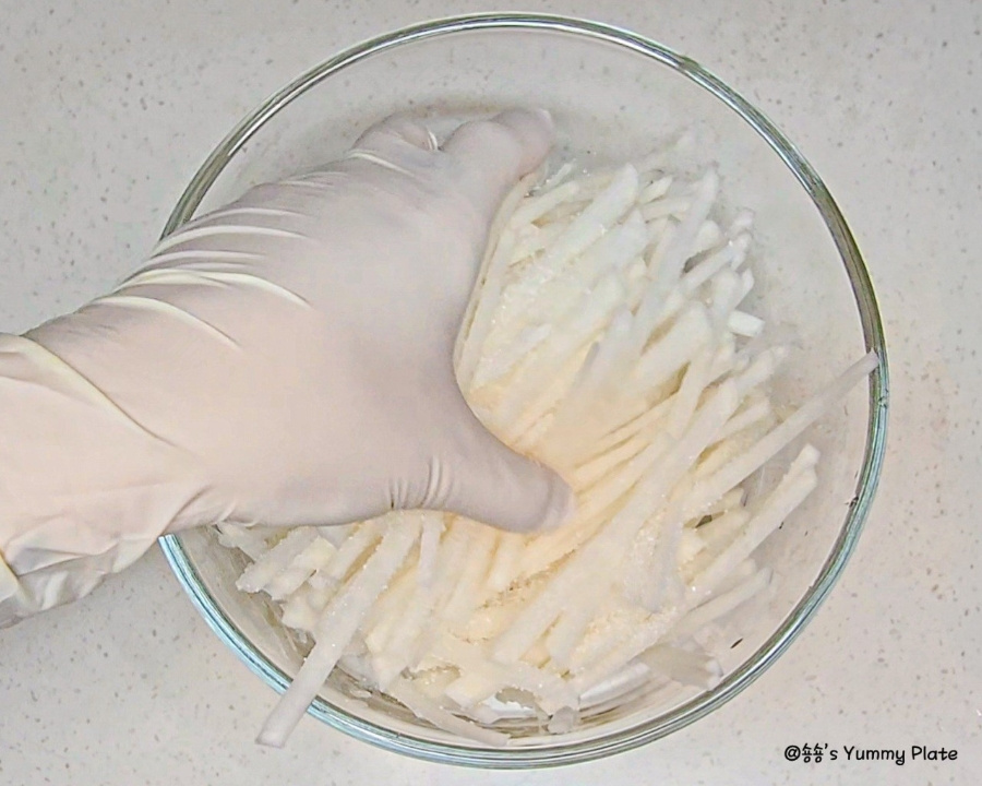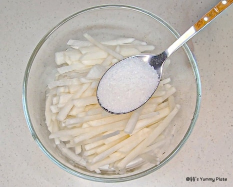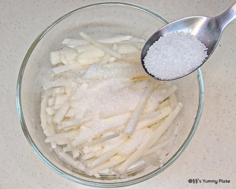 를 소금과 설탕에 함께 버무려주면 소금은 무의 수분을 살짝 빼서 아삭한 식감을 살려주고 설탕은 짠맛을 부드럽게 중화하면서 무 본연의 단맛을 끌어올려 준답니다!