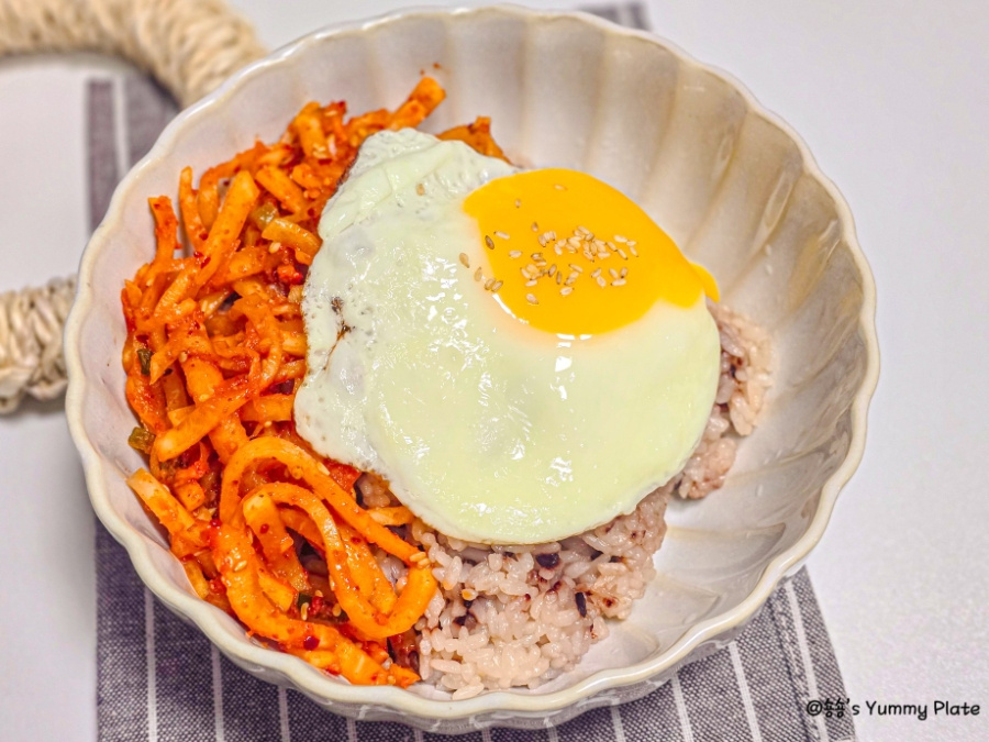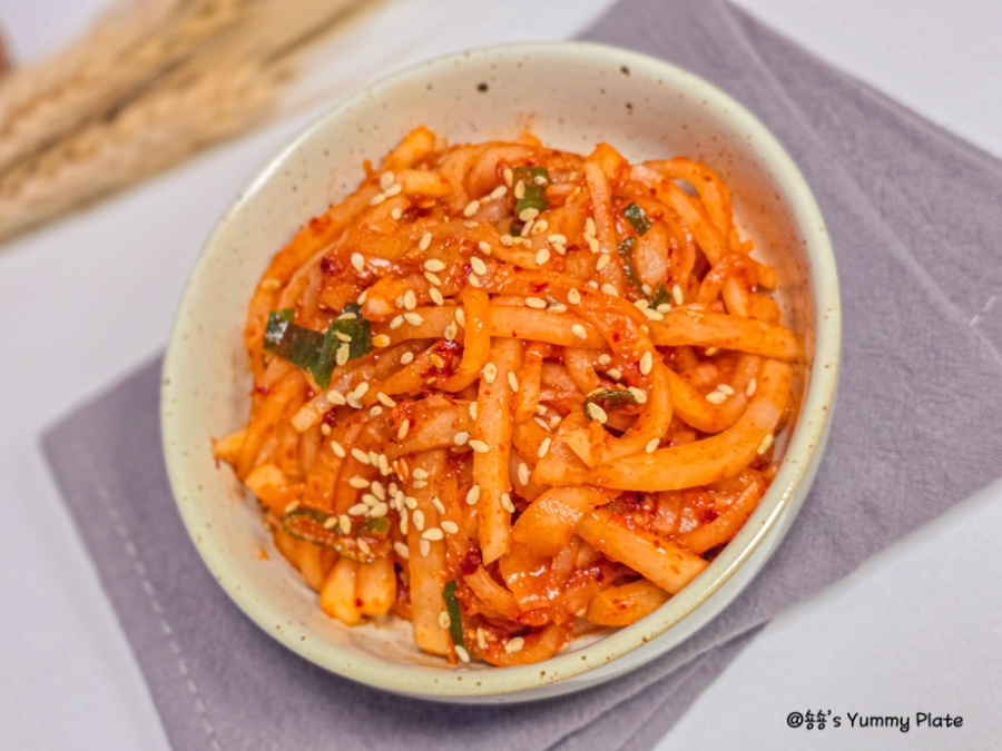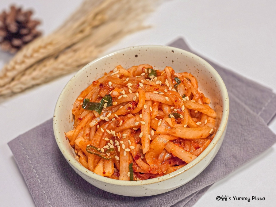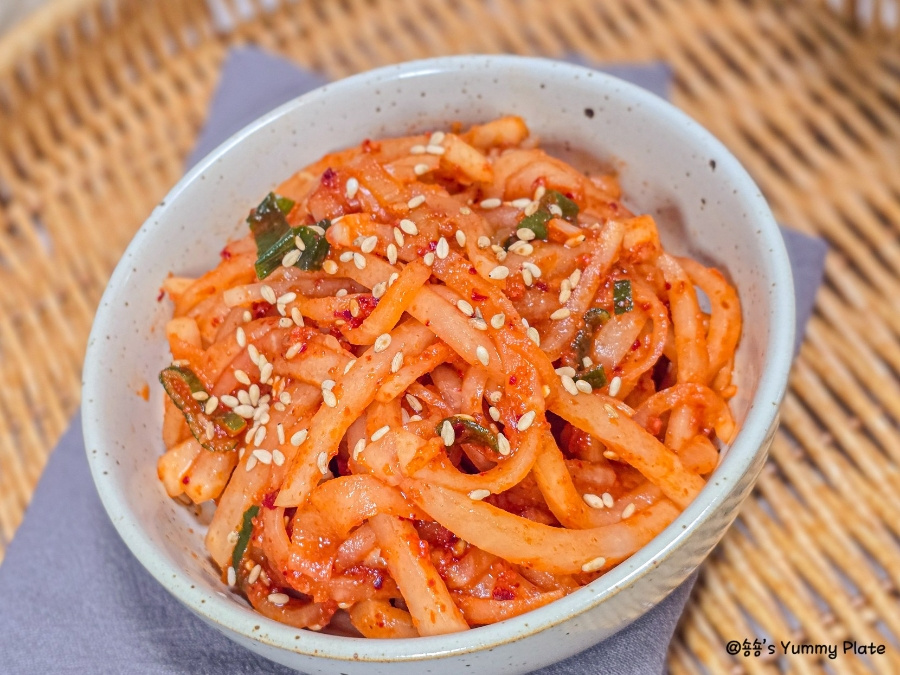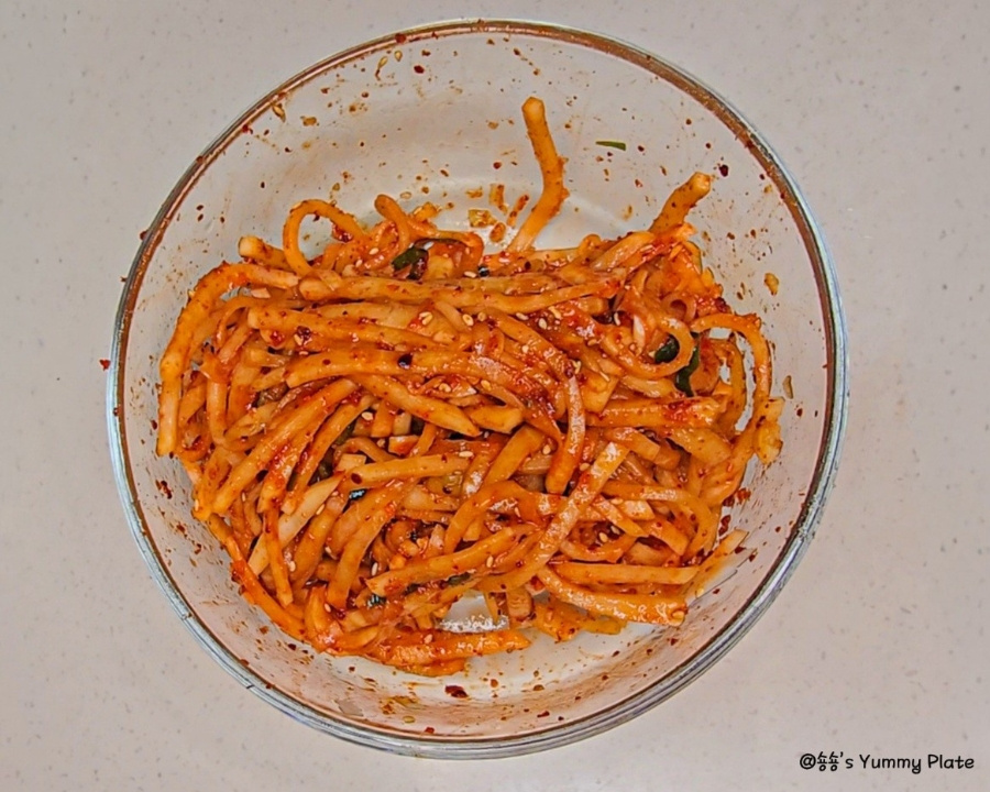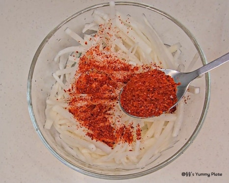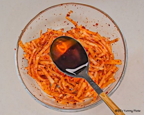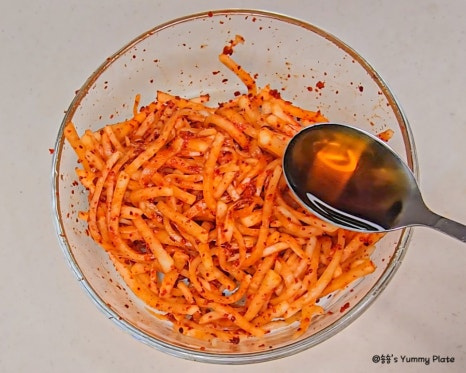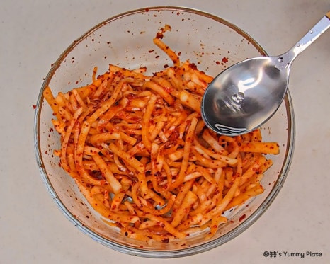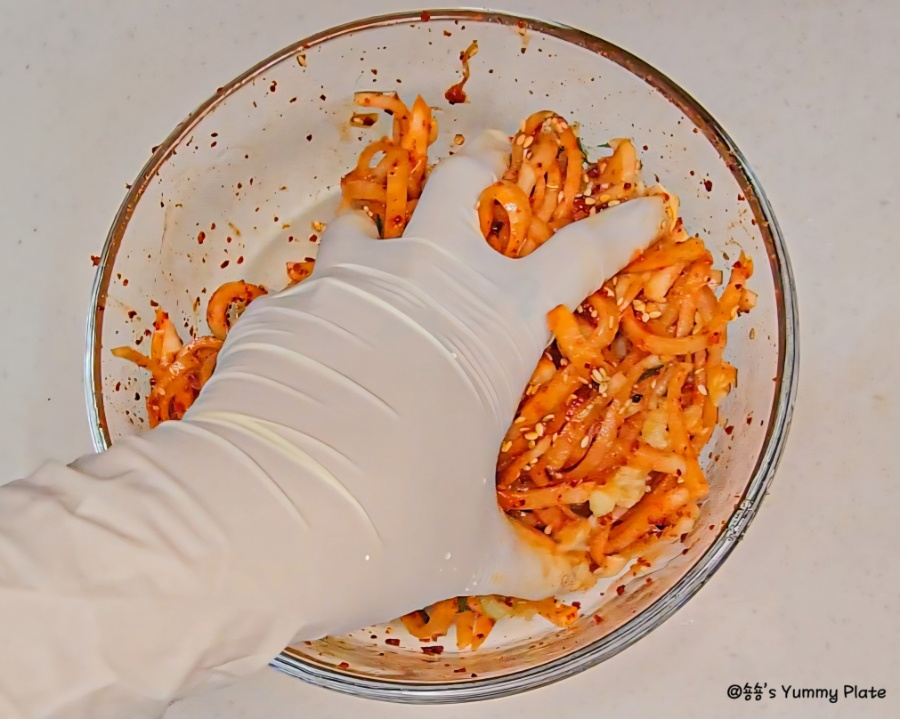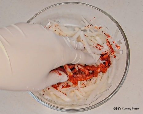 고춧가루를 다른 양념보다 먼저 넣어야 색이 탁해지지 않고 무의 수분에 고춧가루가 자연스럽게 녹아들어 더 촉촉하게 고운 색이 배어든답니다!