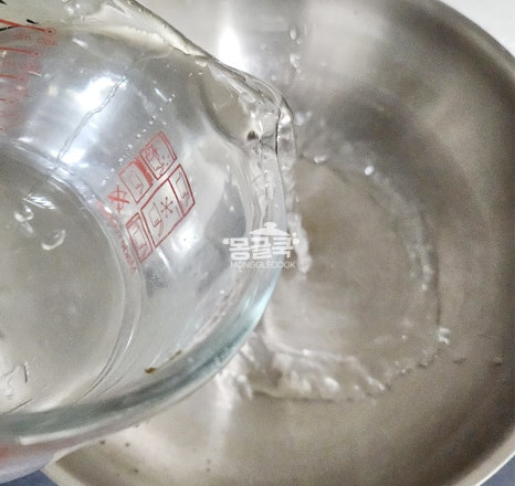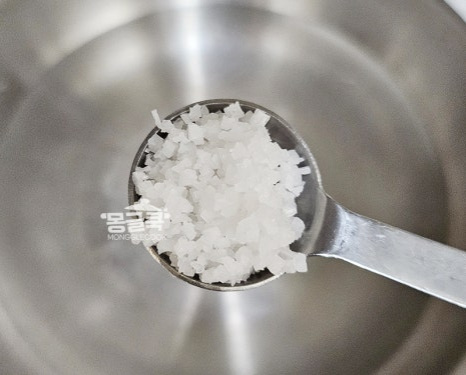 냄비나 찜기 바닥에 물 1리터를 붓고, 소금 1작은술을 넣어 녹여주세요.