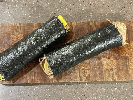김밥용 김을 활용해 튀기지 않아도 김밥 말듯이 단단하게 말아 썰어내면 한입에 쏙 넣어 먹기도 좋은 맛있는 메밀소바김말이를 만들 수 있어요.