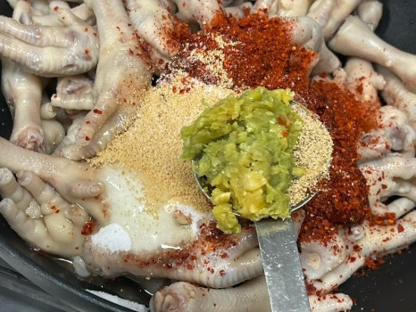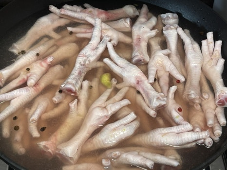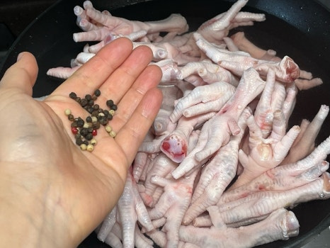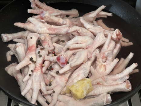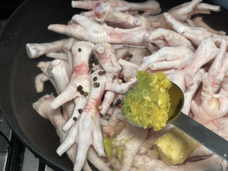 해동된 닭발을 1.5L의 물에 통후추 1T, 간마늘 1T, 간생강1/2T을 넣고 30분 동안 끓여 주세요.