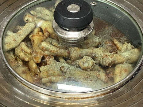 찬물에 헹궈 낸 닭발은 다시 냄비에 담아 준 뒤 고추장3T, 고춧가루5T, 진간장5T,알룰로스분말3T, 액상알룰로스3T, 굴소스2T, 간마늘1T, 소고기다시다1T, 갈아만든배1캔 (238ml), 순후추를 넣고 장갑 낀 손으로 잘 섞어 준 뒤 뚜껑 덮고 20분 동안 중약불에서 졸여주세요.