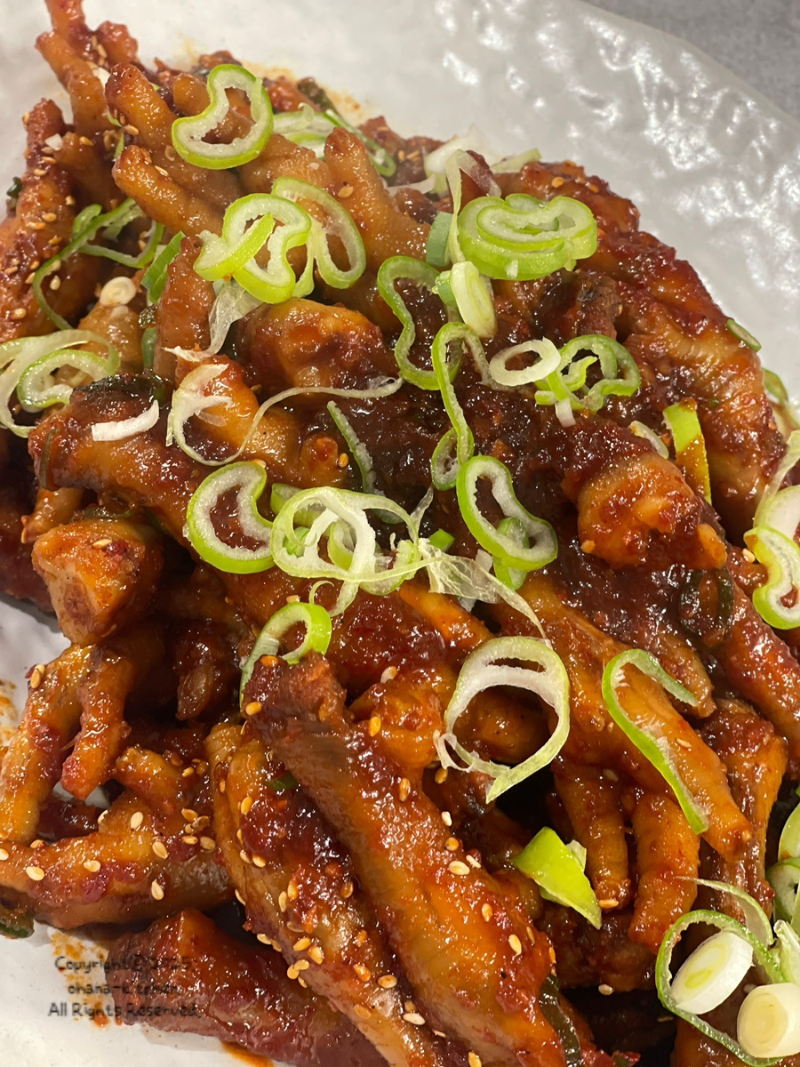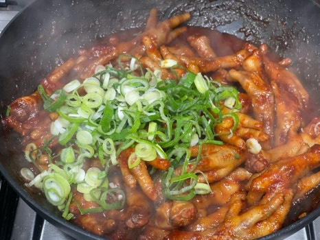양념이 닭발에 스며들면 불을 끄고 슬라이스 한 대파, 참기름, 통깨를 넣고 섞어 마무리해 주세요.
