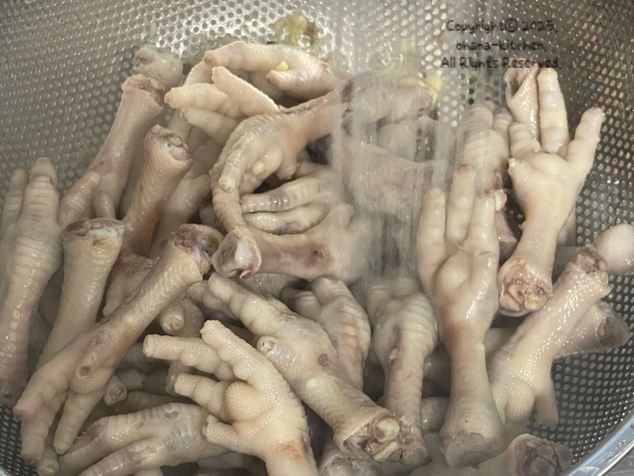 30분 동안 끓인 닭발은 체에 밭쳐 찬물에 헹궈주세요.