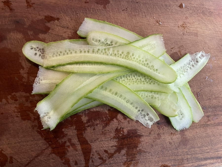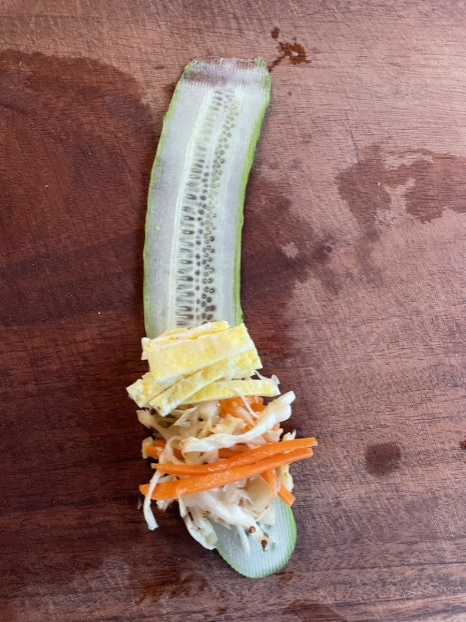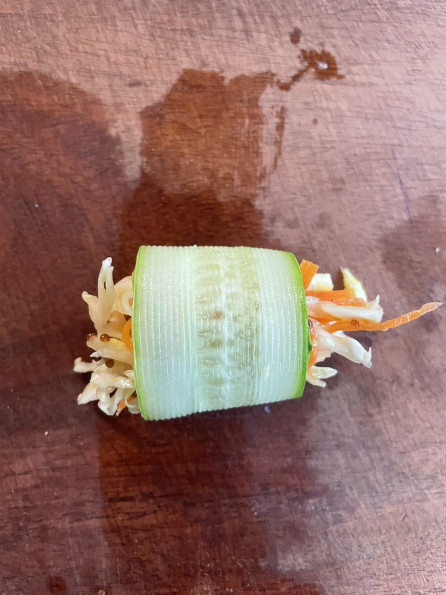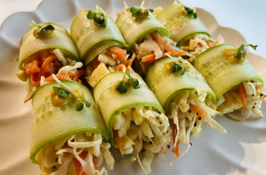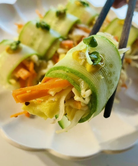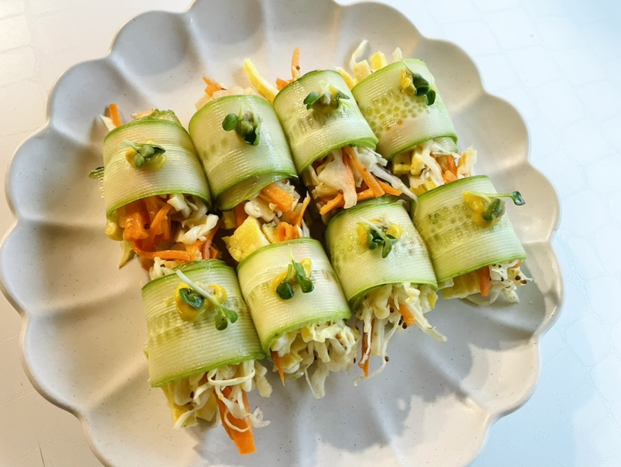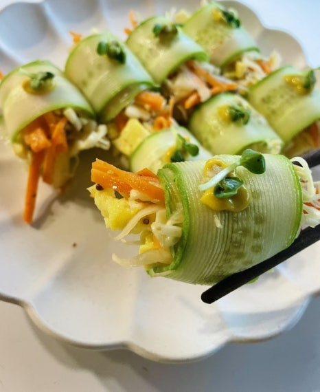 오이를 얇게 저며서 양배추 당근 라페를 넣고 계란 지단도 하나 부쳐서 같이 넣고 돌돌 말았더니 너무 싱싱하고 아삭한 식감도 좋고 라페 특유의 상큼한 머스타드 소스도 산뜻하고 계란지단도 넣어서 든든한 포만감이 있어서 좋더라구요.