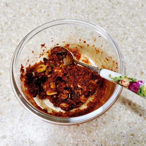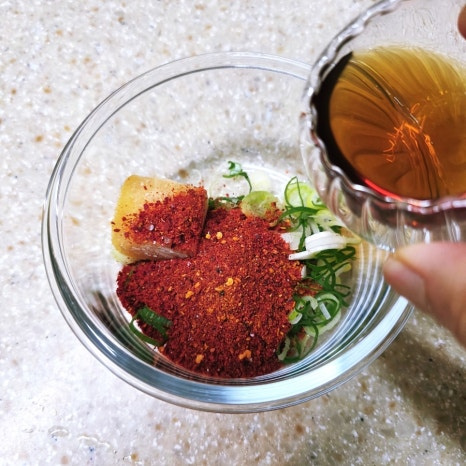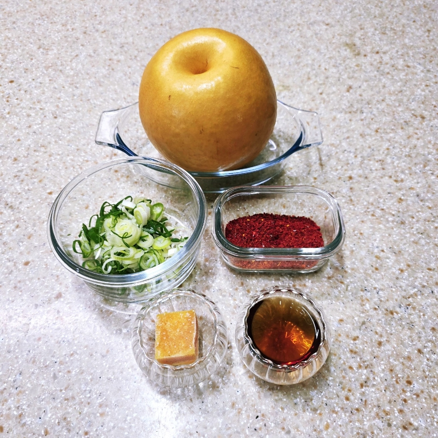 배 1개 참치진액 (숟가락3), 마늘 숟가락2/1 고춧가루 (숟가락2), 대파 숟가락1