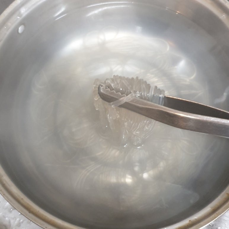 뜨거운 물에 넣으면 빨리 불려집니다.