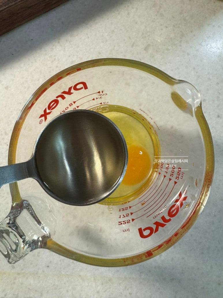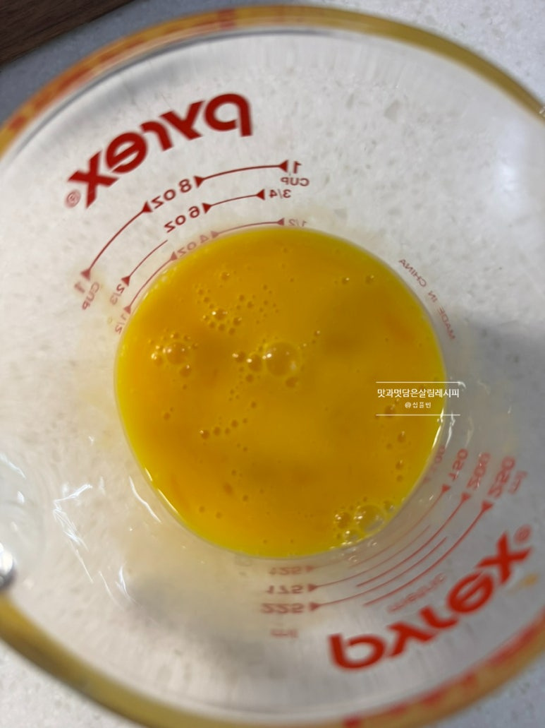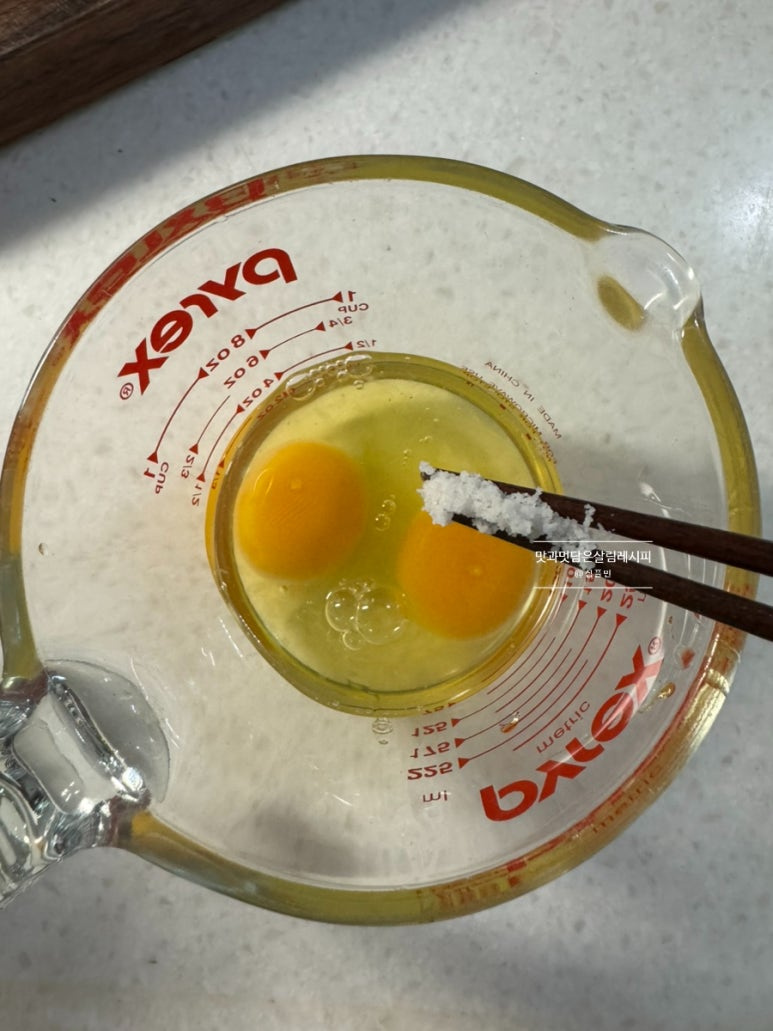 달걀 2개에 소금 두 꼬집 넣어주고요. 미림 1큰술 넣고 비린 맛과 은은한 단맛을 더해줍니다. 곱게 풀어 줍니다.