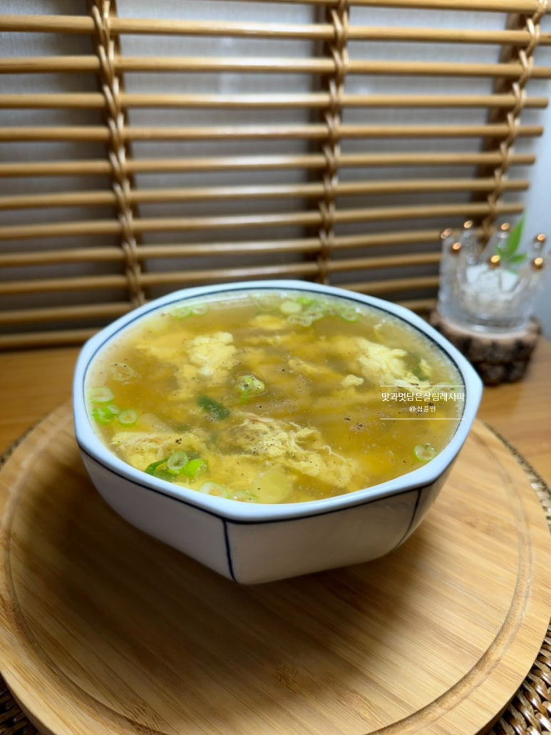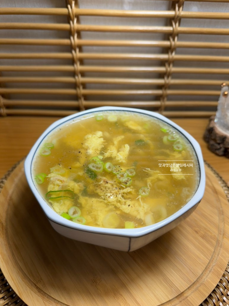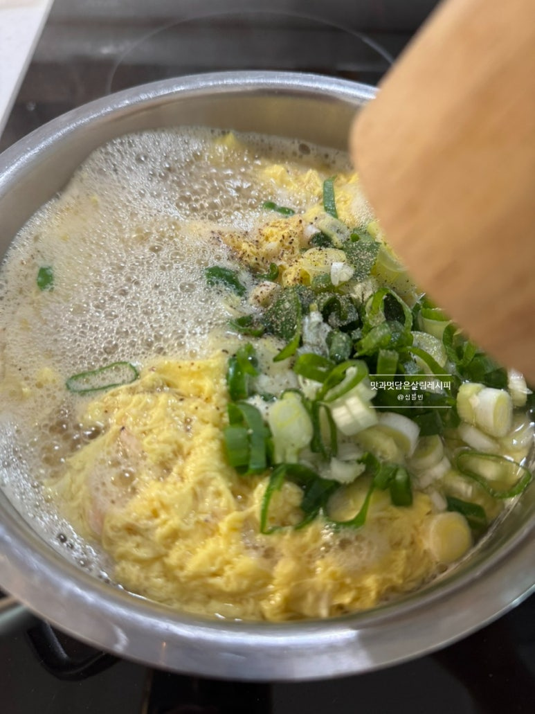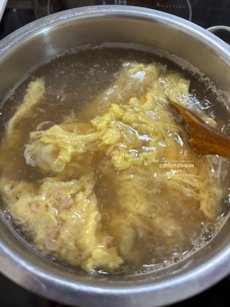 마무리로 송송 썬 파 넣어주고 가볍게 한소끔만 끓여주고요. 후추 취향껏 솔솔 뿌려 마무리합니다. 김치 하나만 추가해도 밥에 말아 후루룩 먹기 좋아서 한 끼 뚝딱 든든하게 해결할 수 있습니다. 평소 떡국이나 잔치국수를 만들어 먹을 때도 달걀 이렇게 풀어 몽글몽글하게 익혀 부드럽게 먹는 것을 좋아하는데요. 국에도 이렇게 달걀 풀어 센 불에 휘리릭 익혀 맑고 깔끔하게 즐겨보세요.