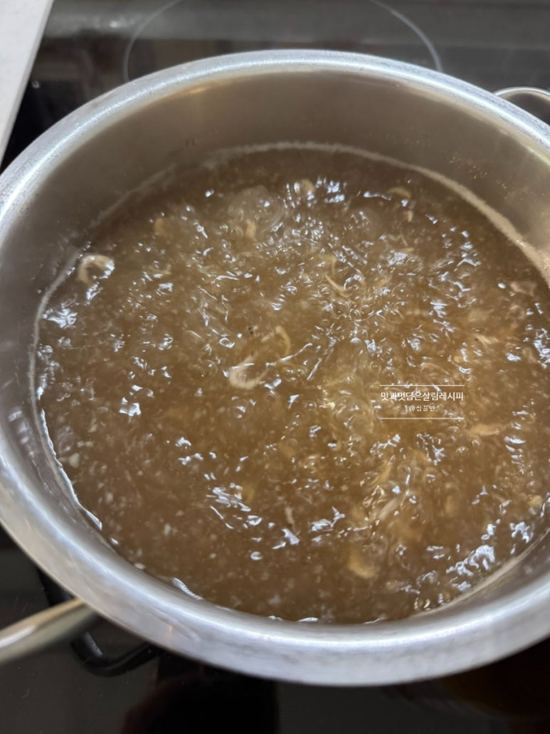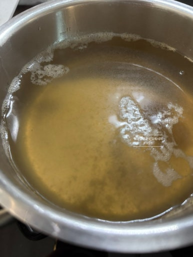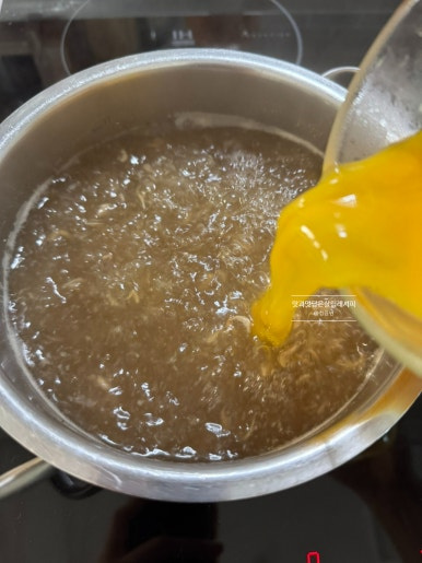 보글보글 센 불로 끓는 상태에서 그대로 부어줍니다. 부은 상태에서 바로 저으면 탁해지기 때문에 5초 정도 가만히 둔 뒤 저어주도록 합니다. 잠시 기다린 뒤 가볍게 저어주세요.