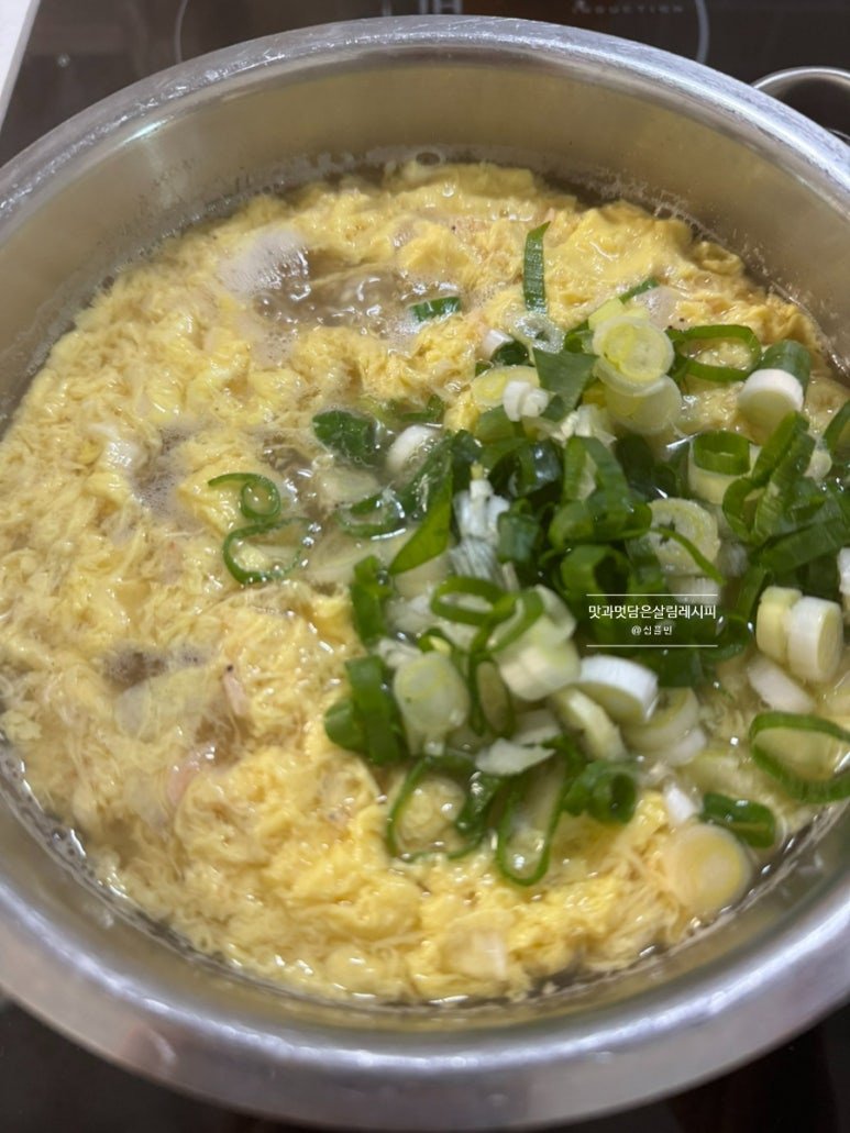 계란 2 개 , 미림 1 큰술 , 소금 두꼬집 , 대파 1/2 대 , 물 800 ml , 코인육수 2 알 , 새우젓 2/3 큰술 , 국간장 1 큰술 , 다진마늘 0.5 큰술 , 후춧가루 소량