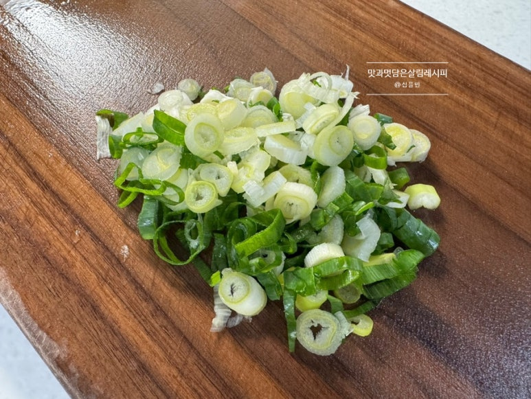 대파 송송 썰어 줍니다. 달걀과 함께 주재료인데요. 굵은 파일 경우 반대 정도 넣어주는데 오늘은 얇아서 한대 모두 썰어 주었어요.