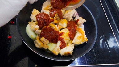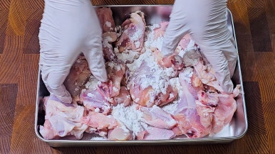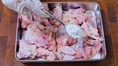※ 끈적해질 수 있으니 꼼꼼하게 많이 묻히지 말고 대충 묻혀주세요! ※ 닭고기를 전분에 버무리면 부드러워지고, 잡내를 제거할 뿐 아니라 양념도 잘 뱁니다!