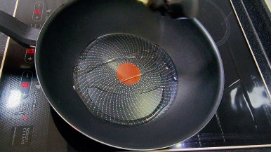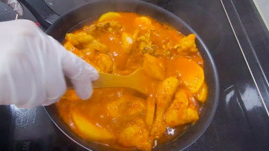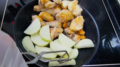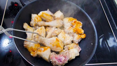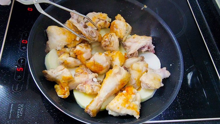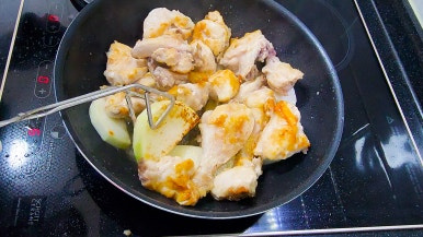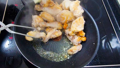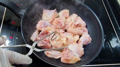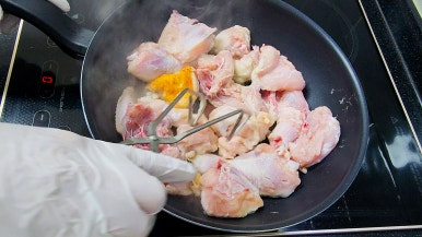 ※ 닭기름이 잘 나오도록 껍질 부분이 팬 바닥을 향하게 넣어주세요! ※ 전분이 남아있지 않게 골고루 구워주세요!