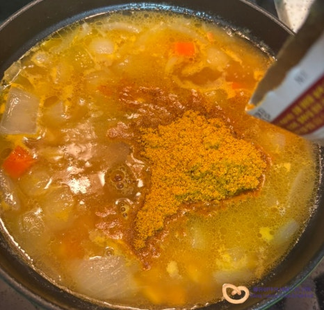 이어서 카레가루도 넣어주세요. 카.레.는 한번에 털어 넣는 것보다 3~4번으로 나누어 넣어주면 더 잘 풀어져요