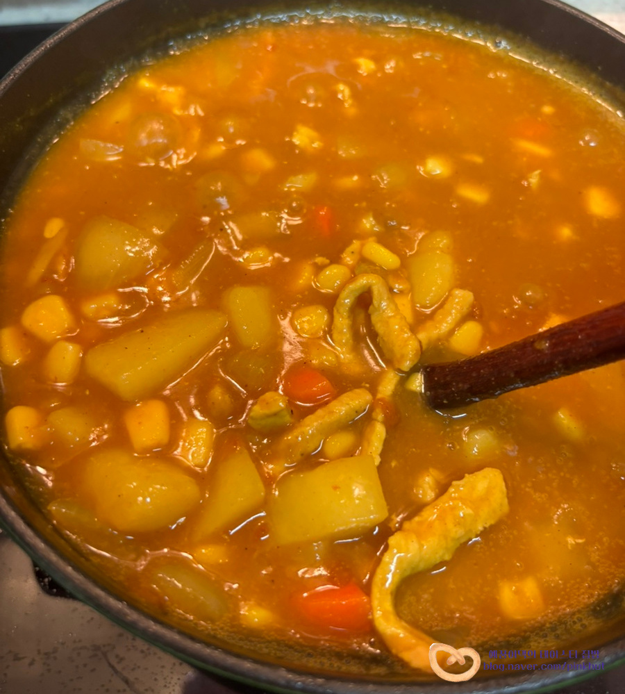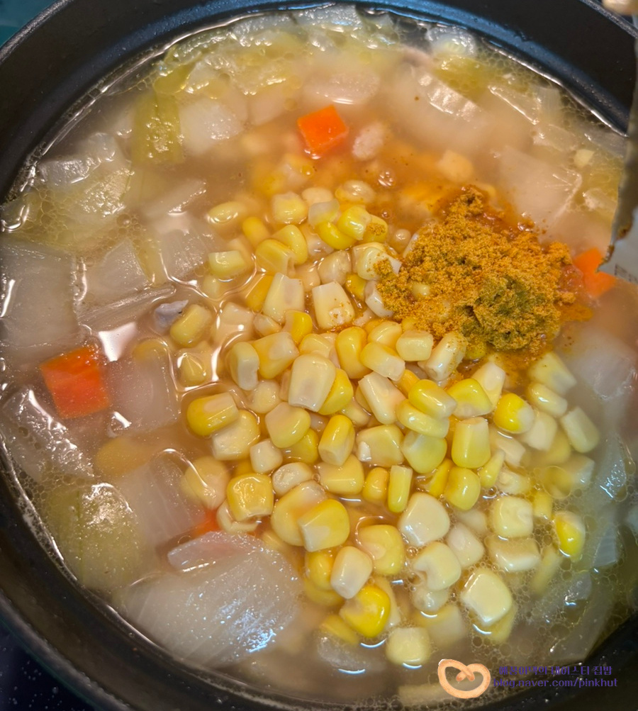 5분이 경과한 후 뚜껑 열고 약불로 줄여주세요. 옥수수 통조림을 넣어줍니다. 저는 우선 1/2캔만 넣고 맛있어서 나머지도 넣어 끓였어요 옥수수 좋아하는 분들은 1캔 다 넣어주세요 :) 옥수수 식감이 카레와 잘 어울려서 꽤 맛있어요.