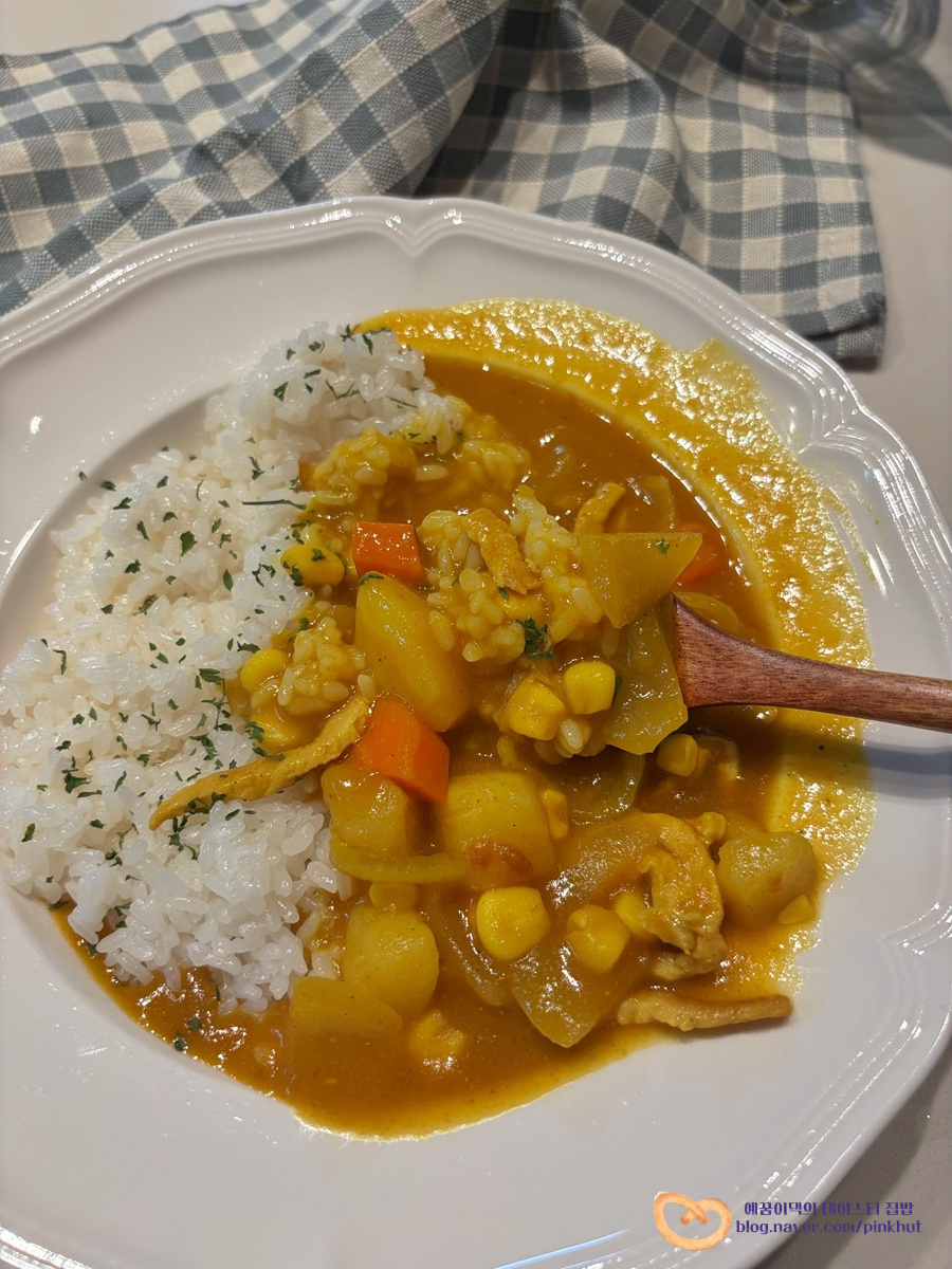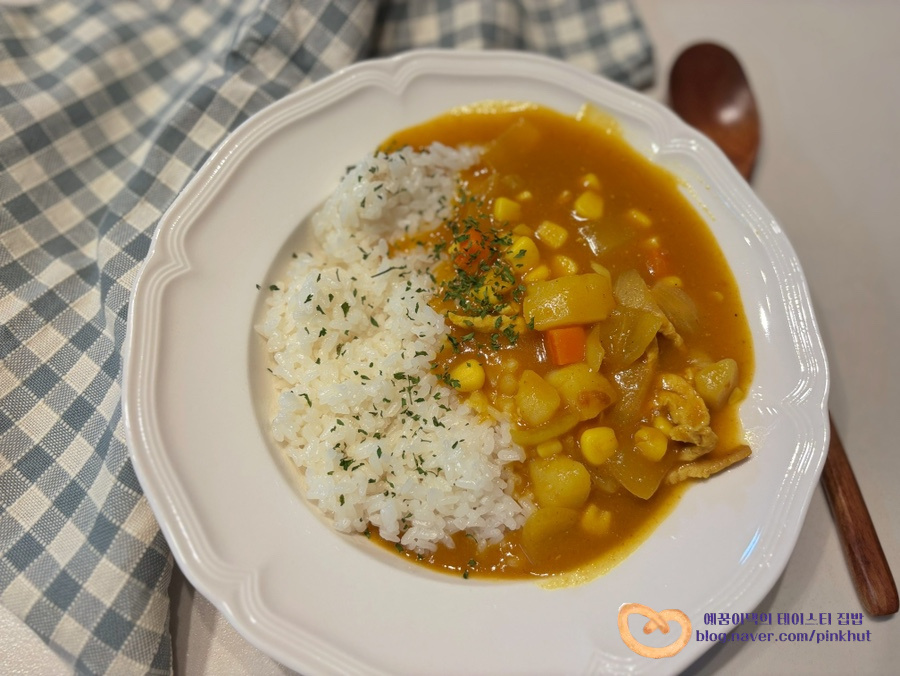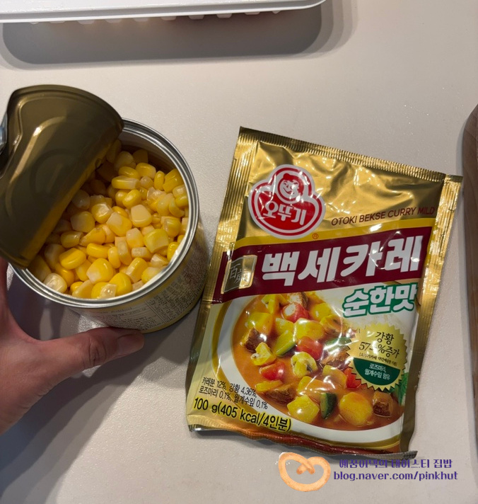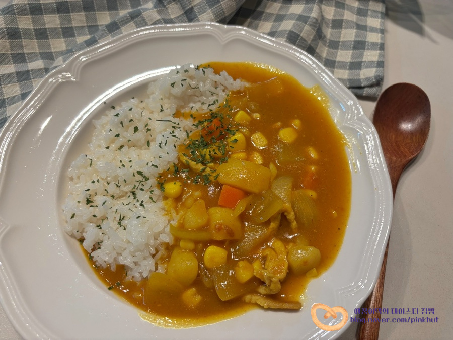 카레 재료에 옥수수 통조림이 신의 한 수! 재료가 간단해서 자취하는 분들을 위한 요리로도 좋겠어요. 완전 강추드려요.