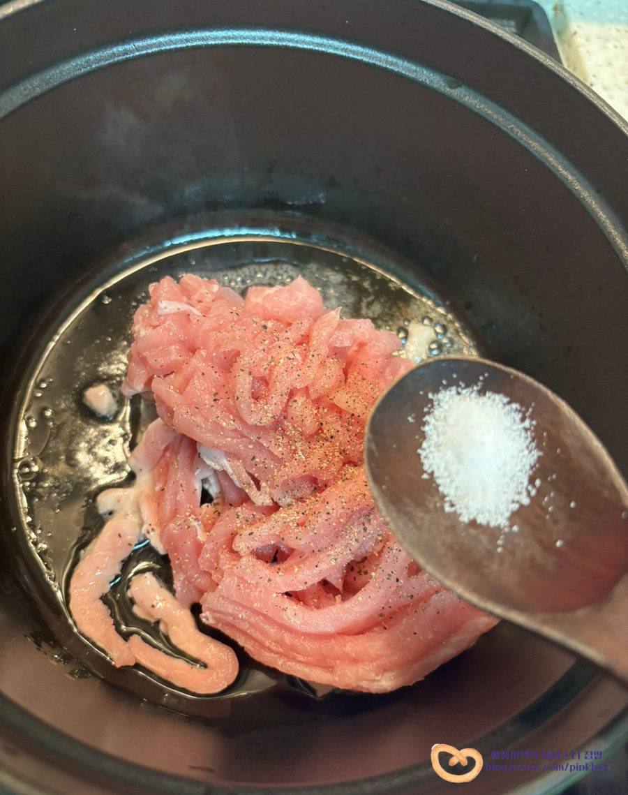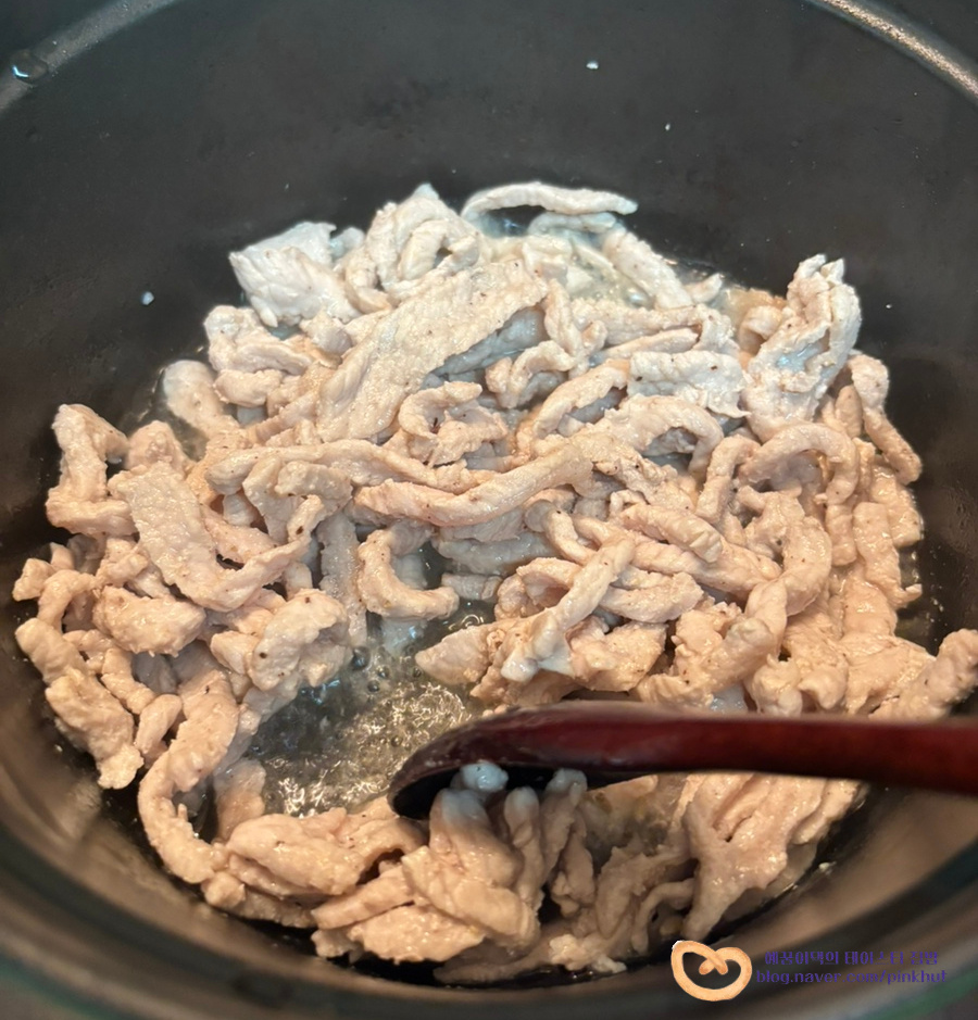 달군 냄비에 참기름 1T, 식용유 1T 두르고요 핏기를 제거한 돼지고기, 소금 2꼬집, 후춧가루 톡톡 넣어주세요. 후춧가루는 드르륵 가는 것 말고 노란 뚜껑의 순후추를 사용하라는 것이 수학 일타강사님의 팁! 저는 없어서 드르륵 가는 후춧가루 사용했어요 >