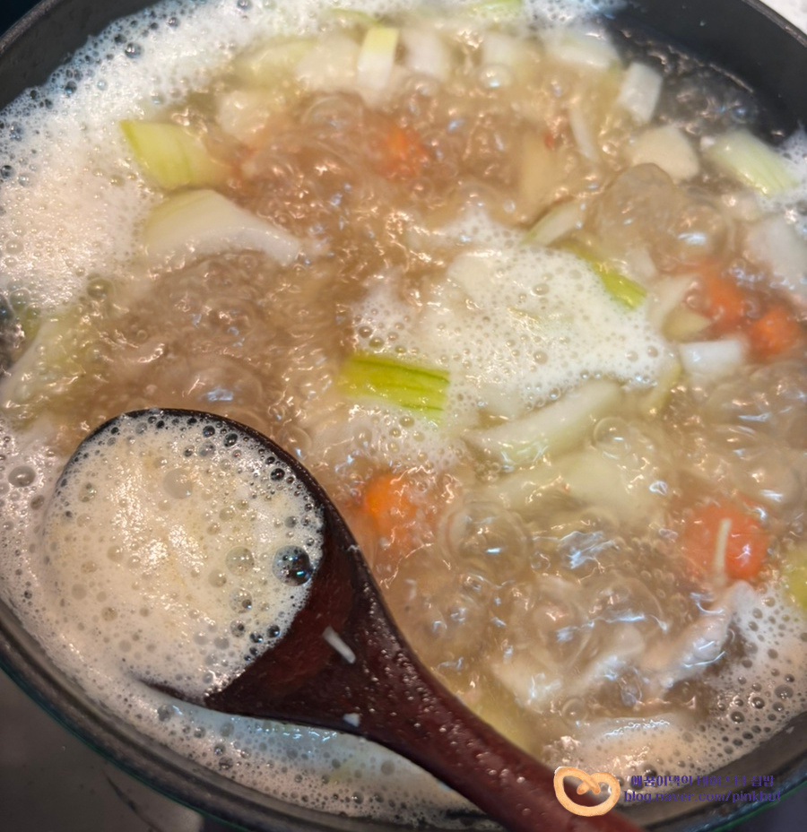 보글보글 끓일 때 떠오르는 거품은 숟가락으로 깔끔하게 걷어내어 주었어요