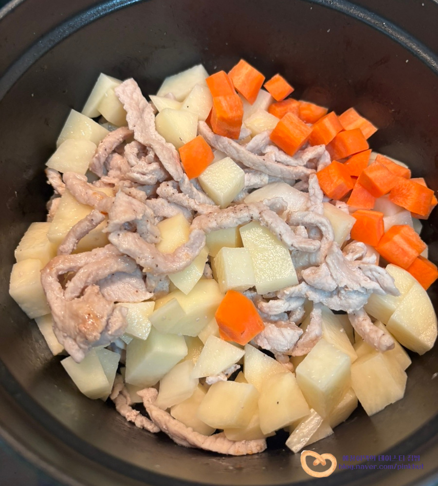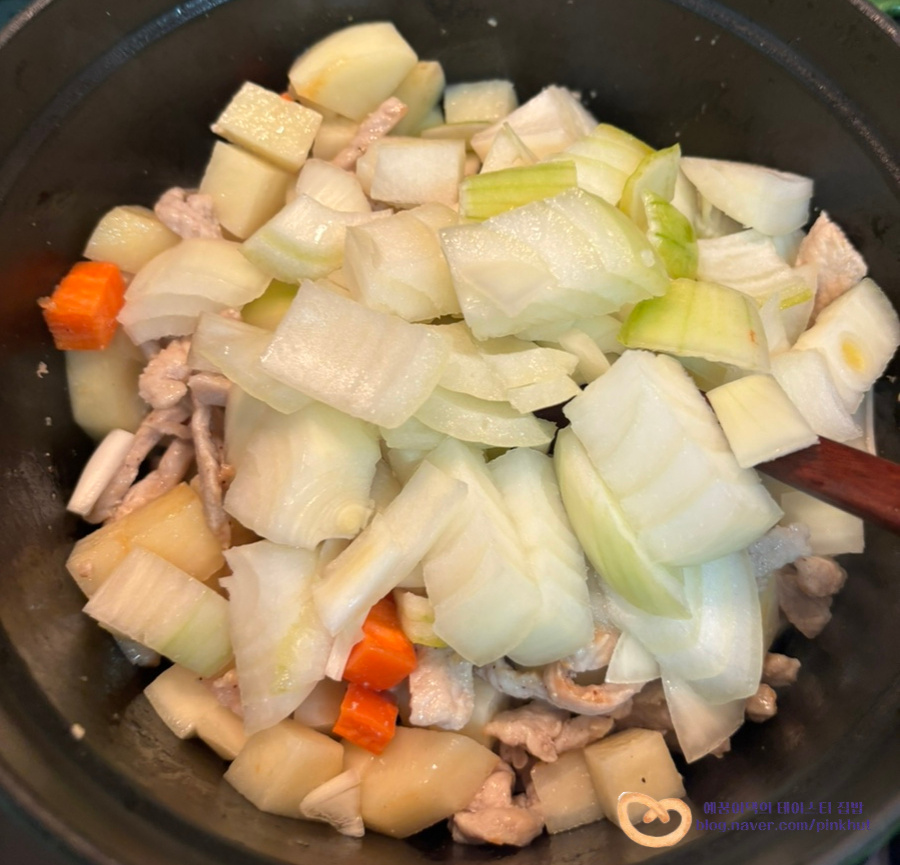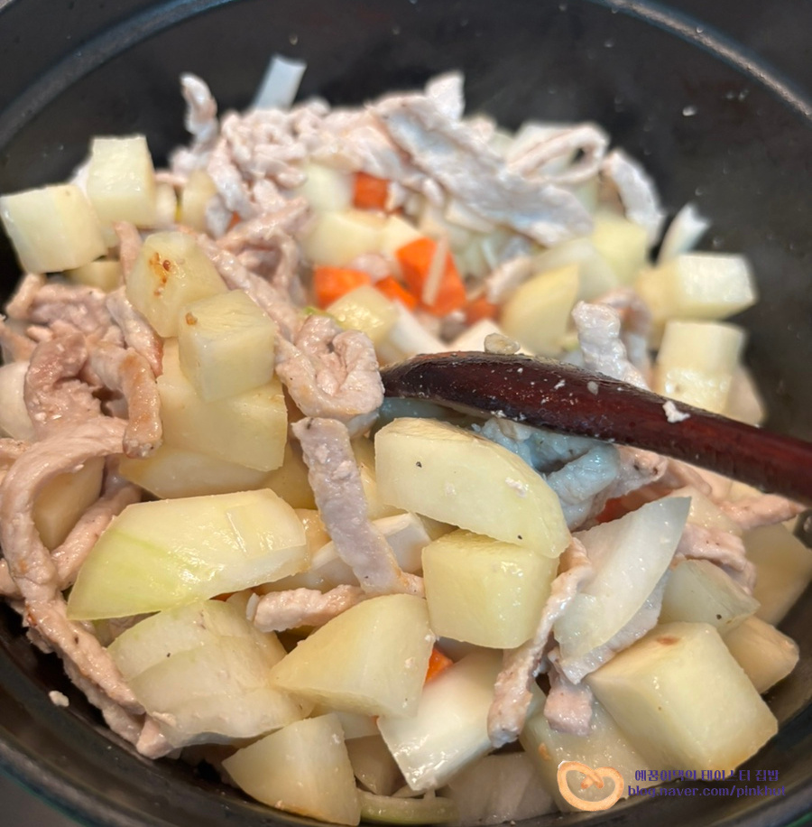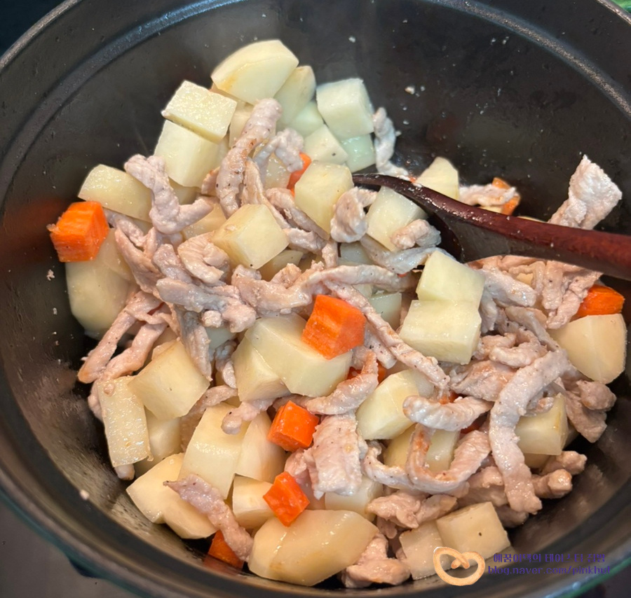 치지직 볶아지면서 고소한 향이 올라와요. 돼지고기가 사진처럼 익은 컬러감이 나오면 썰어 둔 감자, 당근을 넣어 볶아주세요.