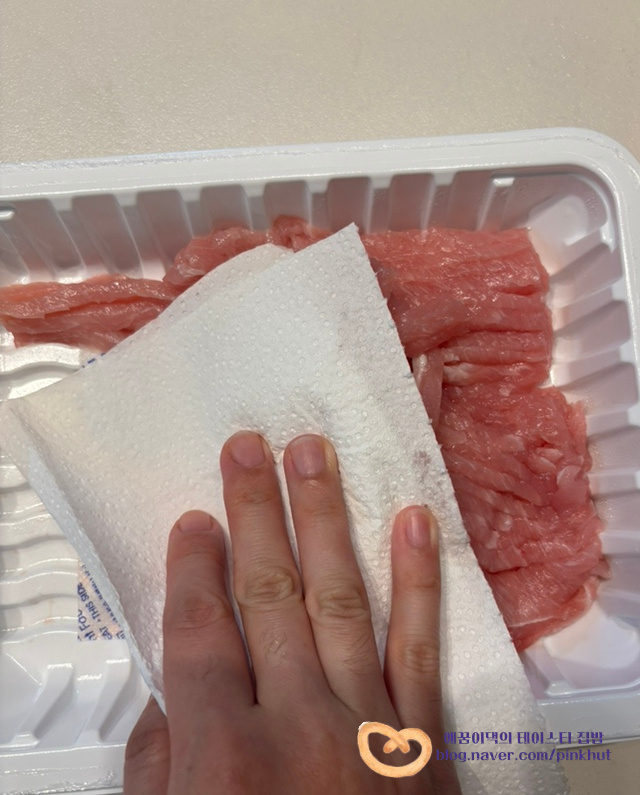 키친타올로 꾹꾹 눌러 핏기를 제거하고요, 고기 부위는 앞다리살, 등심 등 비계가 많지 않은 부위로 선택하면 맛있게 드실 수 있어요.