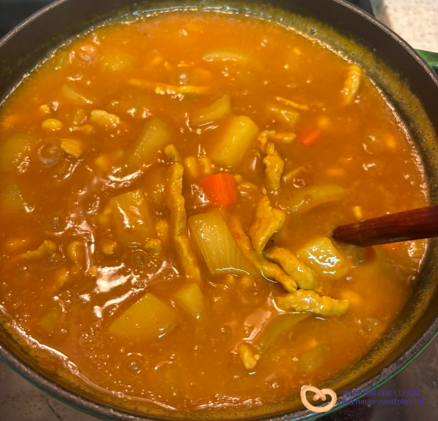 눌지 않게 숟가락으로 바닥을 저어가며 약불에 뭉근하게 끓여주었어요. 분말카레 만드는법 할 때 덩어리가 씹히면 식감도 좋지 않고 간도 잘 맞지 않거든요. 풀어지지 않은 덩어리는 한 번 더 곱게 풀어주세요