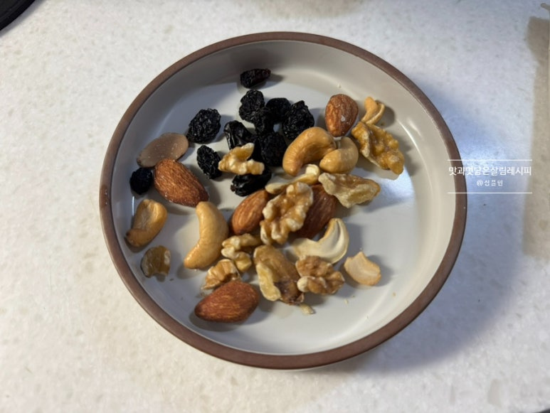고소한 견과류 넣어주어도 조합이 좋아요. 저는 한 봉지씩 소포장 된 제품을 활용해 소량씩 다양하게 넣어주었는데요. 집에 있는 견과류 아무거나 넣어도 좋고 분태로 잘게 다져 넣어도 좋습니다.