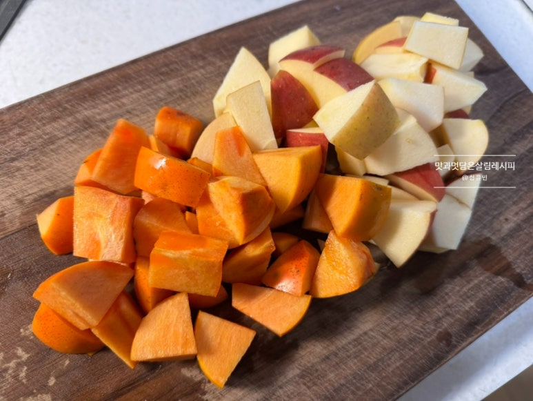 세척한 단감과 사과도 물기를 깨끗이 제거해 준 뒤 한입 쏙쏙 먹기 좋은 크기로 썰어주세요.