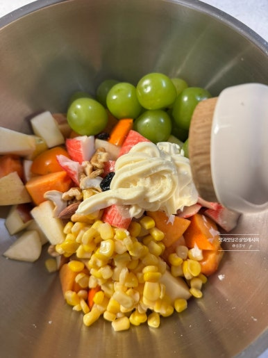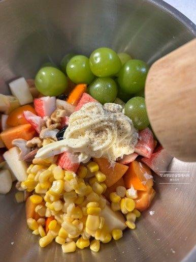 마요네즈만 넣고 버무려도 충분히 맛있고요. 당도가 떨어지는 과일을 맛있게 활용하고자 할 땐 설탕이나 알룰로스 또는 꿀을 추가해 주면 좋습니다.