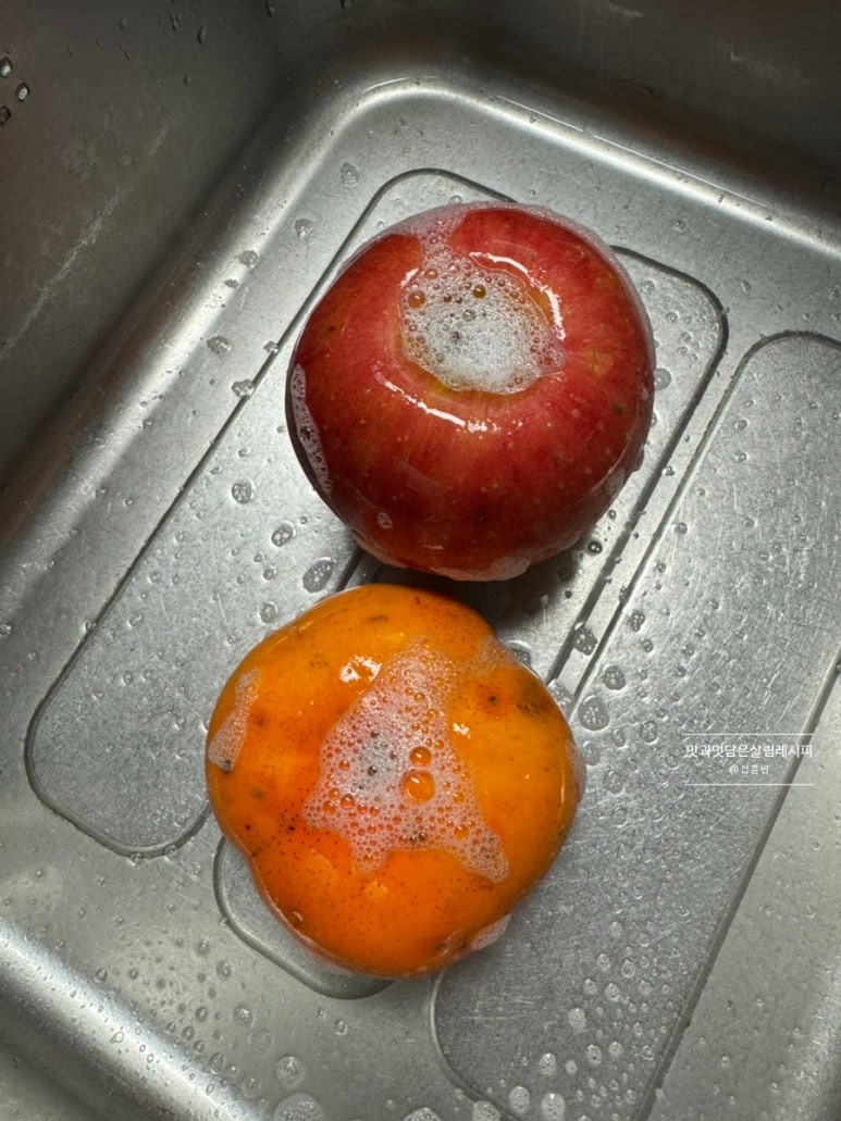 과육보다 껍질에 식이섬유를 비롯한 칼륨, 비타민 등이 과육보다 풍부하다고 해요. 그래서 이럴 때 껍질째 섭취하면 좋기 때문에 깨끗하게 세척해 줍니다. 저는 액상 세척제인 베이킹 소다수를 활용해 뽀득뽀득 깨끗하게 씻어주었어요.