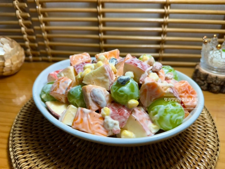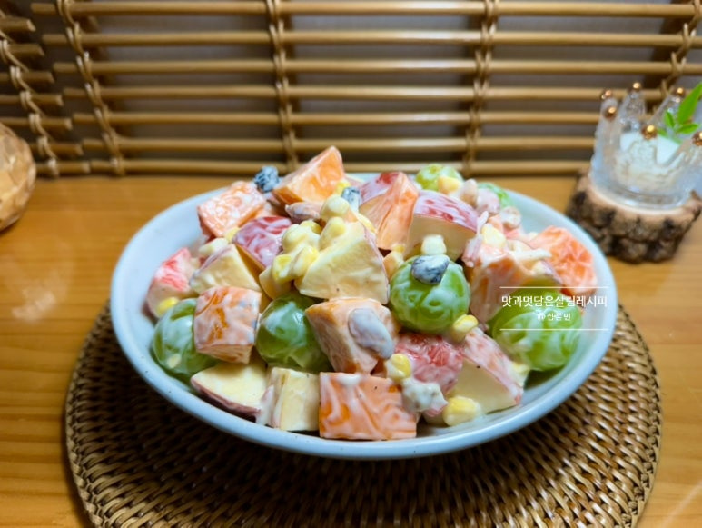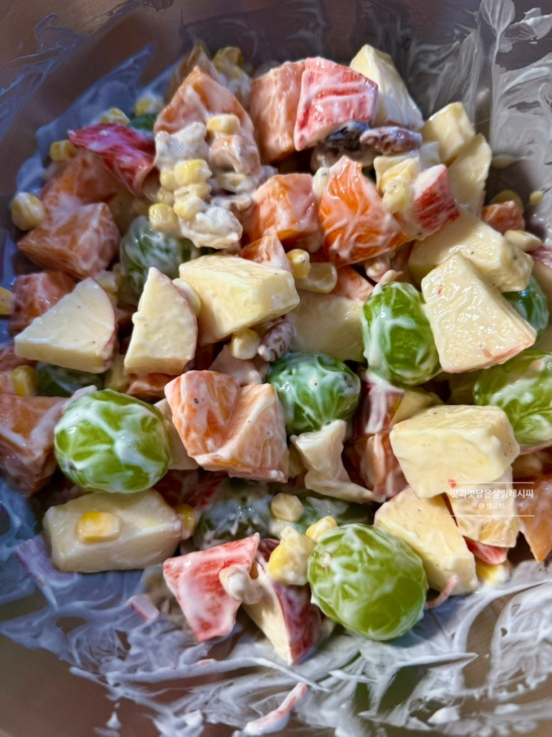 샐러드이지만 포만감 최고인지라 간단한 한 끼 식사 대용으로도 참 좋습니다. 마요네즈가 부담스럽다면 요즘 다양하게 나오는 종류로 칼로리를 낮춘 제품을 활용해도 좋고요. 설탕 대신 알룰로스나 스테비아 등으로 당 함량 낮춘 재료들로 사용해 보세요.