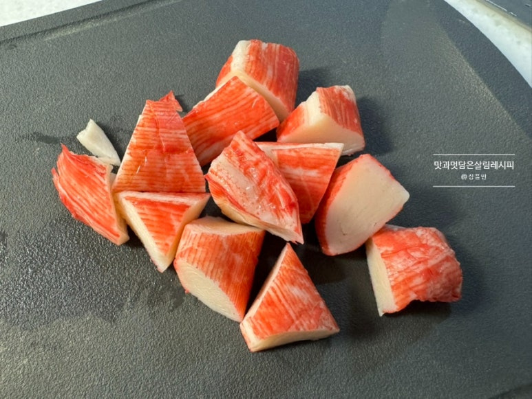 단백한 재료로 삶은 메추리알이나 감자, 크래미 넣으면 좋은데요. 오늘은 냉장고에 남아있는 크래미 활용했어요. 먹기 좋은 사이즈로 썰어줍니다.