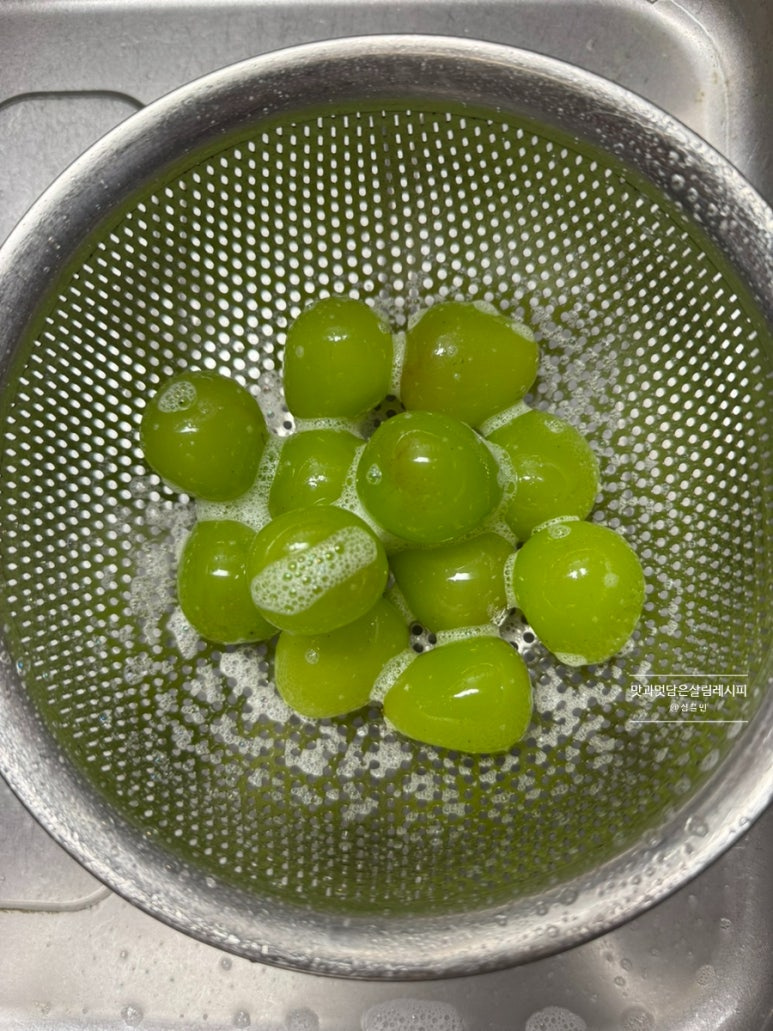 푸른 색감으로 요즘 많이 저렴해진 가격으로 쉽게 만나볼 수 있는 샤인 머스캣 넣어주기로 했어요. 오이 넣어도 좋기에 오이 사용 시에는 수분이 많은 씨 부분을 긁어내고 썰어줍니다.