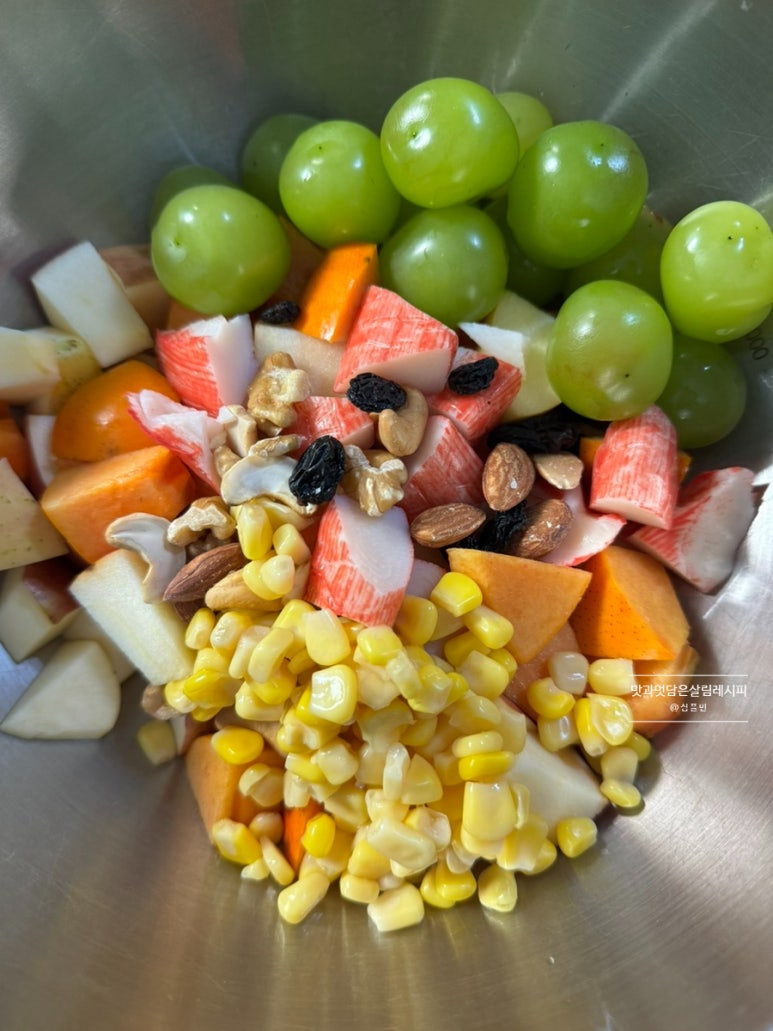 껍질에 영양소가 풍부하기 때문에 모두 섭취하기 위해 깨끗한 세척해 주고요. 붉은색의 사과, 주황빛의 감, 푸른빛의 샤인 머스캣과 견과류, 건과일, 크래미, 캔 옥수수로 맛있게 버무려 보았어요. 딱 정해진 재료를 사용하지 않는 것이기에 냉장고에 있는 야채 과일 동원하면 좋아요.
