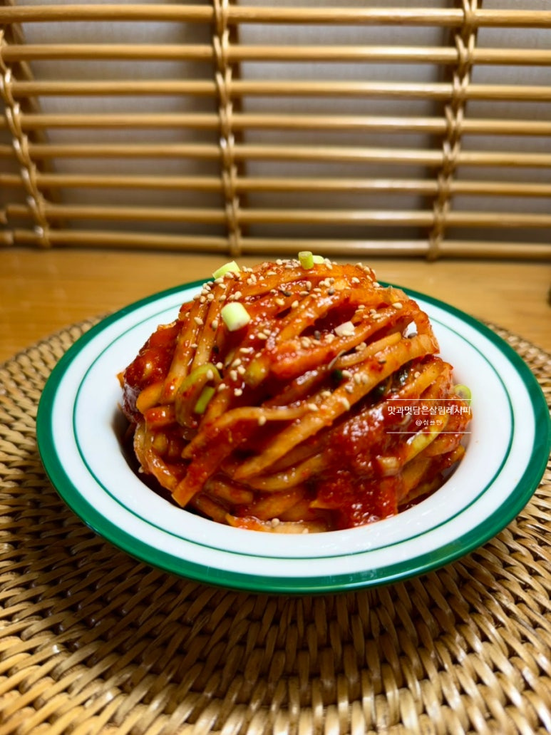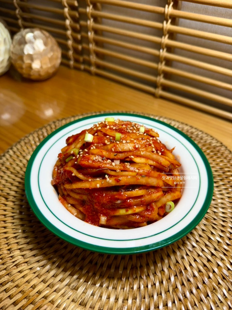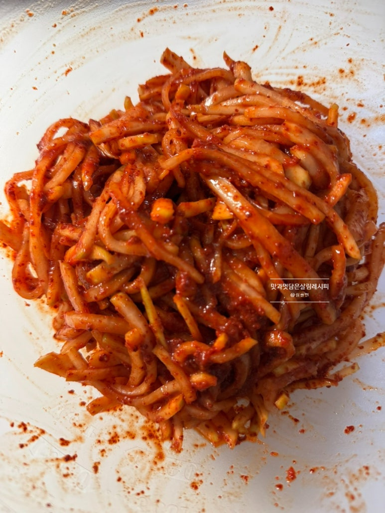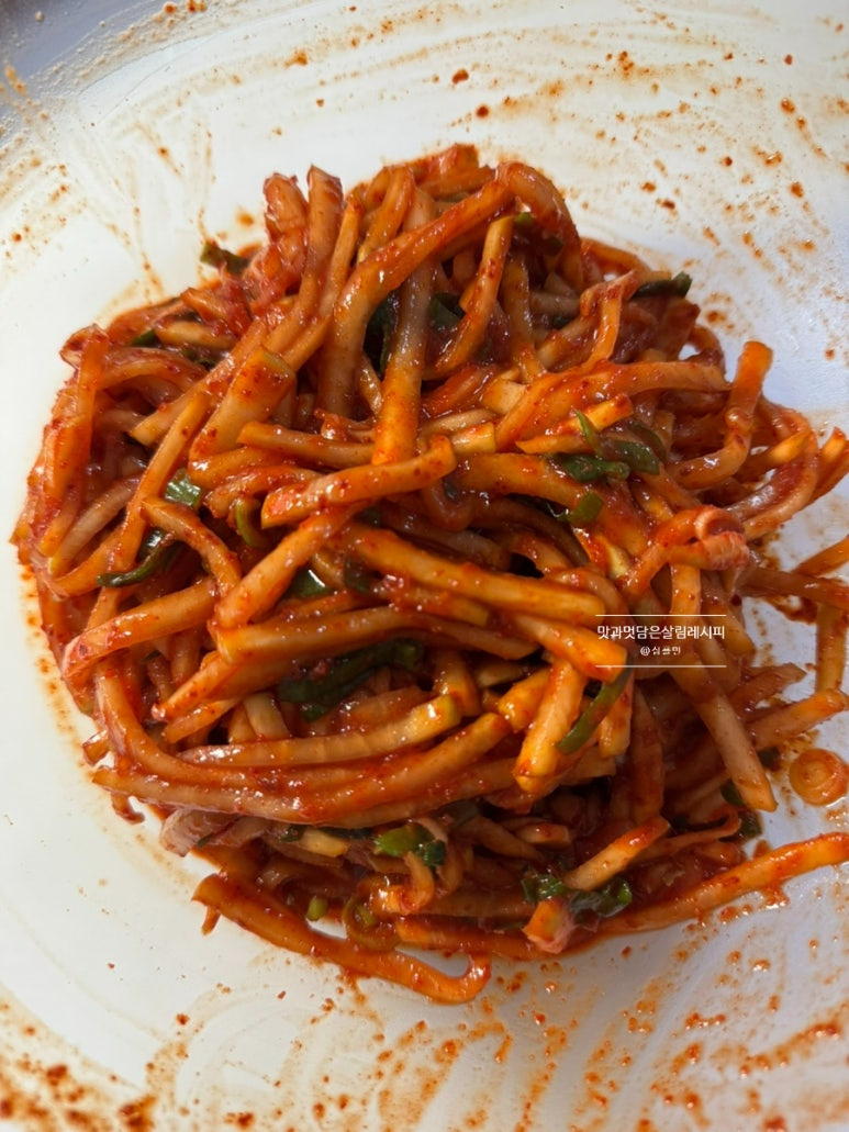 이렇게 무쳐주기만 해도 촉촉하고 윤기까지 흐르는 맛있는 무생채 완성되었어요. 보쌈으로 즐겨도 좋은 김치로 진하고 맛있게 즐길 수 있는 맛이랍니다.