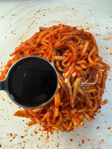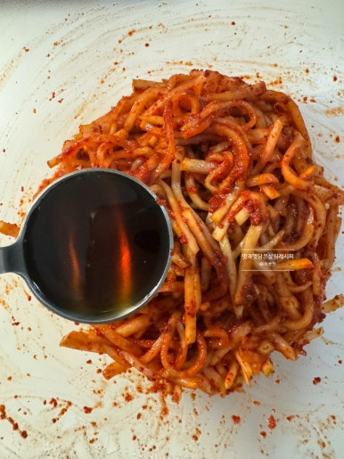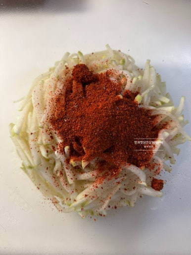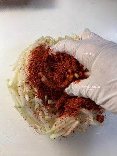 고춧가루 5큰술을 넣어줍니다. 다음 조물조물 먼저 섞어주어 먹음직스러운 빨간 빛깔 입혀주고요.