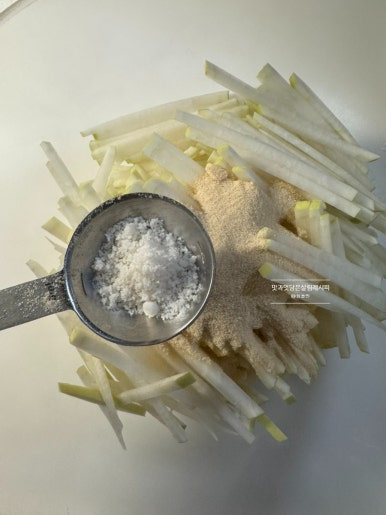 썬 무채를 볼에 담아주고요. 설탕 4큰술, 소금 반 큰술을 먼저 넣고 고루 섞어줍니다. 방송에서 소개한 레시피는 조금 달기도 하여 저는 4큰술보다 살짝 줄여주었는데 취향껏 조절해 주도록 해요. 그대로 넣어도 달콤새콤 한 맛으로 맛있게 만들 수 있어요.