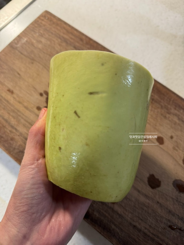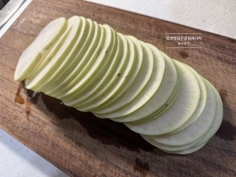 너무 얇지 않고 적당한 두께로 썰어야 씹는 맛이 있기 때문에 적당한 두께로 썰었는데요. 이는 개인의 취향에 맞춰 자유롭게 썰어주어도 좋아요.