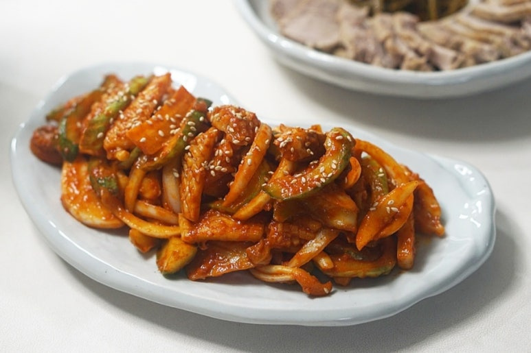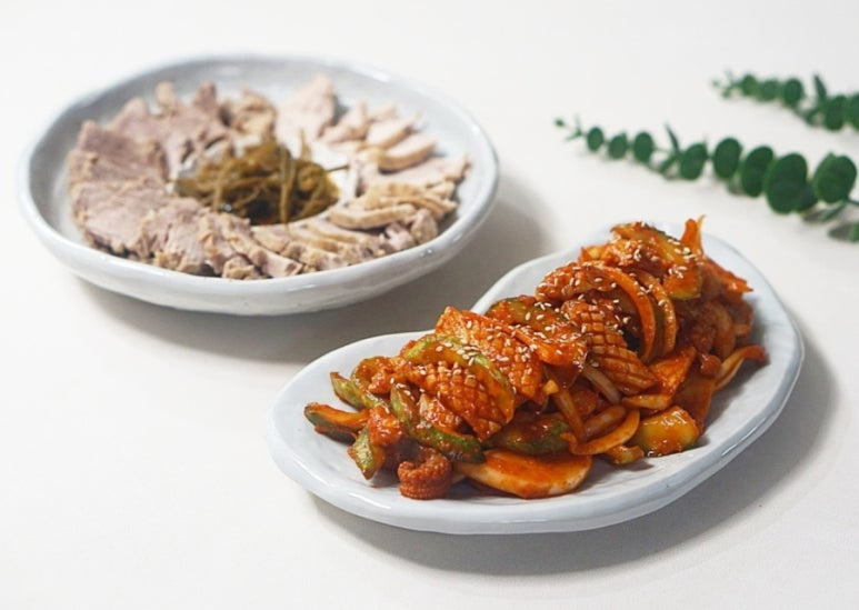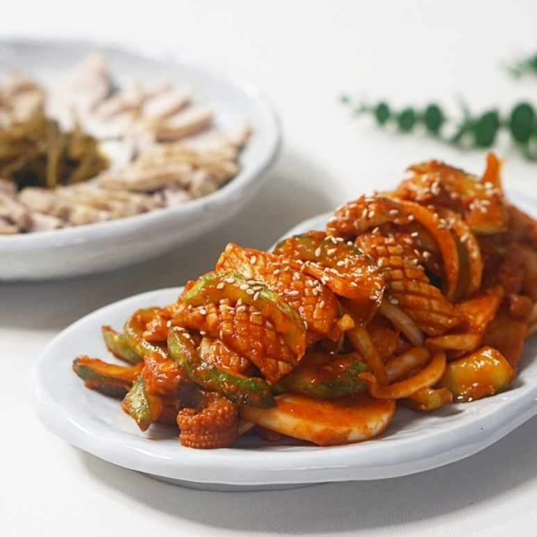 소금에 살짝 절인 아삭한 오이와 탱글한 갑오징어를 새콤달콤한 초무침 양념에 버무려 만드는 오이 오징어초무침은 기름진 육류나 전을 많이 먹은 후 입안을 개운하게 정리해주는데 아주 좋은 메뉴예요. 손이 많이 가는 전이나 갈비찜 같은 명절 음식들 사이에서 빠르게 준비할 수 있고 손님 접대용으로 내놓아도 깔끔하고 건강해 많은 사랑을 받을 수 있는 메뉴이니 코 앞으로 다가온 추석에 맛있게 만들어 보세요 '◡'