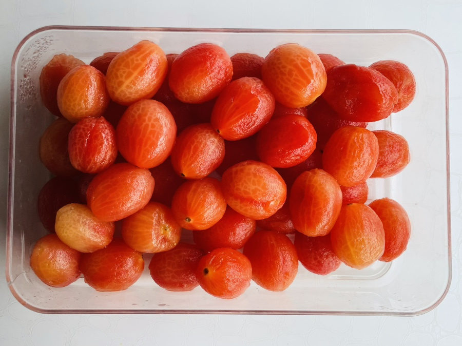 방울 토마토 껍질을 벗겨 주세요.
