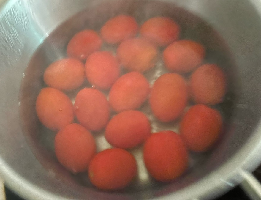 끓는 물에 방울 토마토를 넣고 3분 정도 데쳐 주세요.