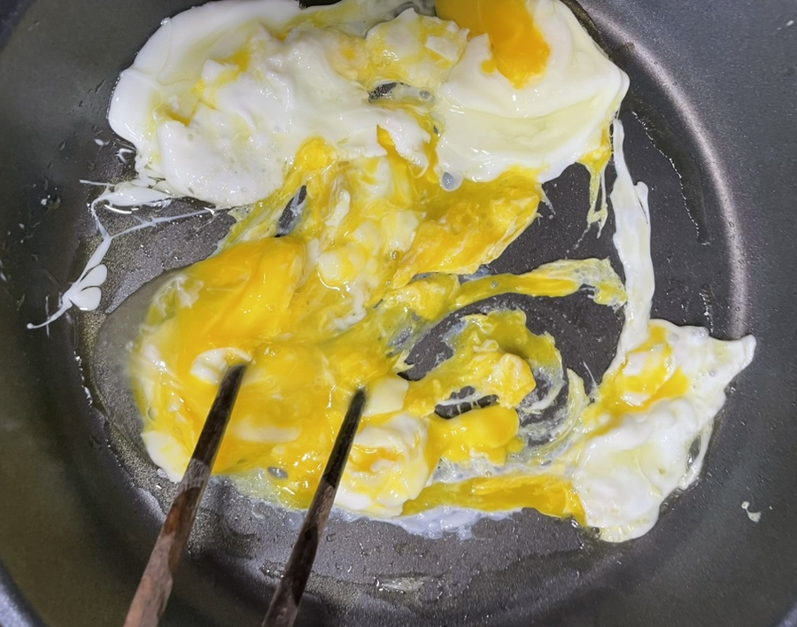 계란이 반 정도 익으면 젓가락으로 저어서 스크램블도 에그를 만들어 주세요.