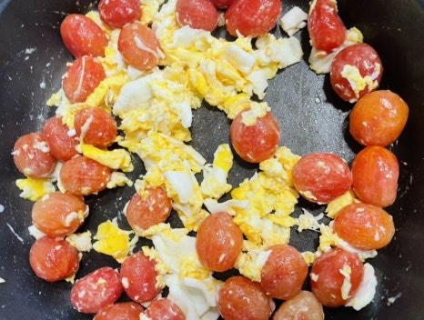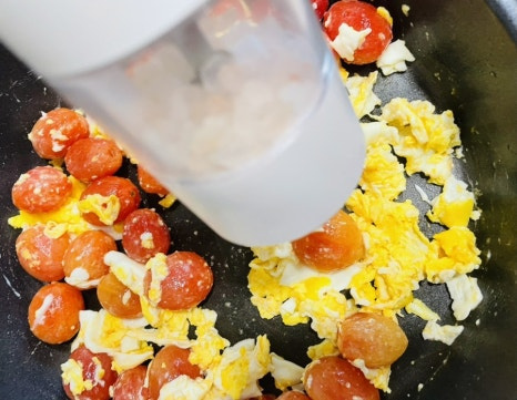방울 토마토를 넣고 소금 3꼬집 정도 넣고 한소끔 볶아 주세요.
